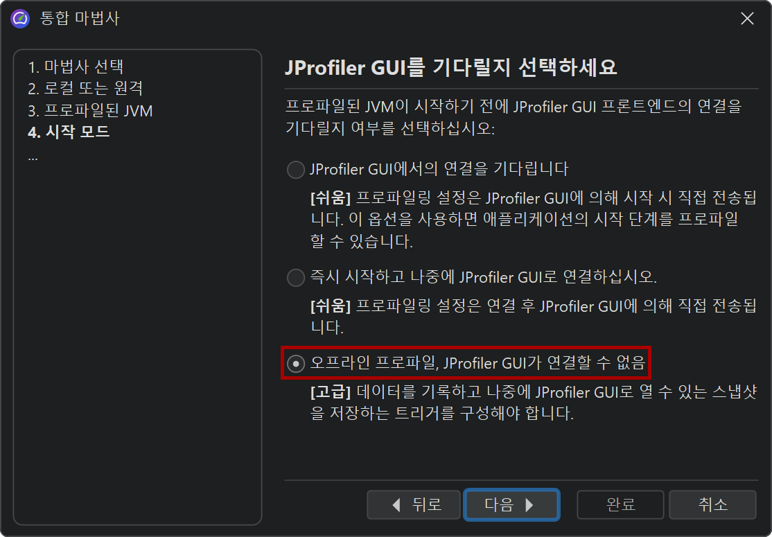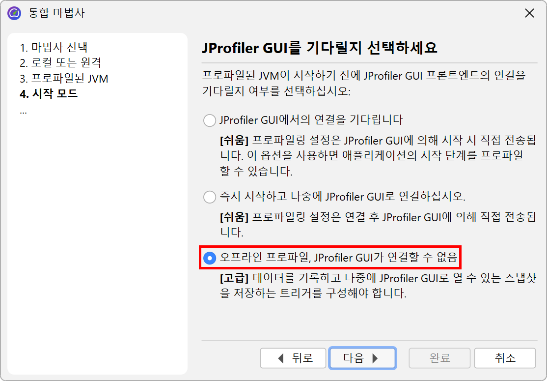 통합 마법사를 사용하여 애플리케이션 서버를 프로파일링할 때, 프로파일링을 위한 VM 매개변수가 Java 호출에 삽입되도록 시작 스크립트나 구성 파일이 항상 수정됩니다. 모든 통합 마법사에는 "시작" 단계에서 오프라인 프로파일링을 구성하기 위한 "오프라인 프로파일링" 옵션이 있습니다.
