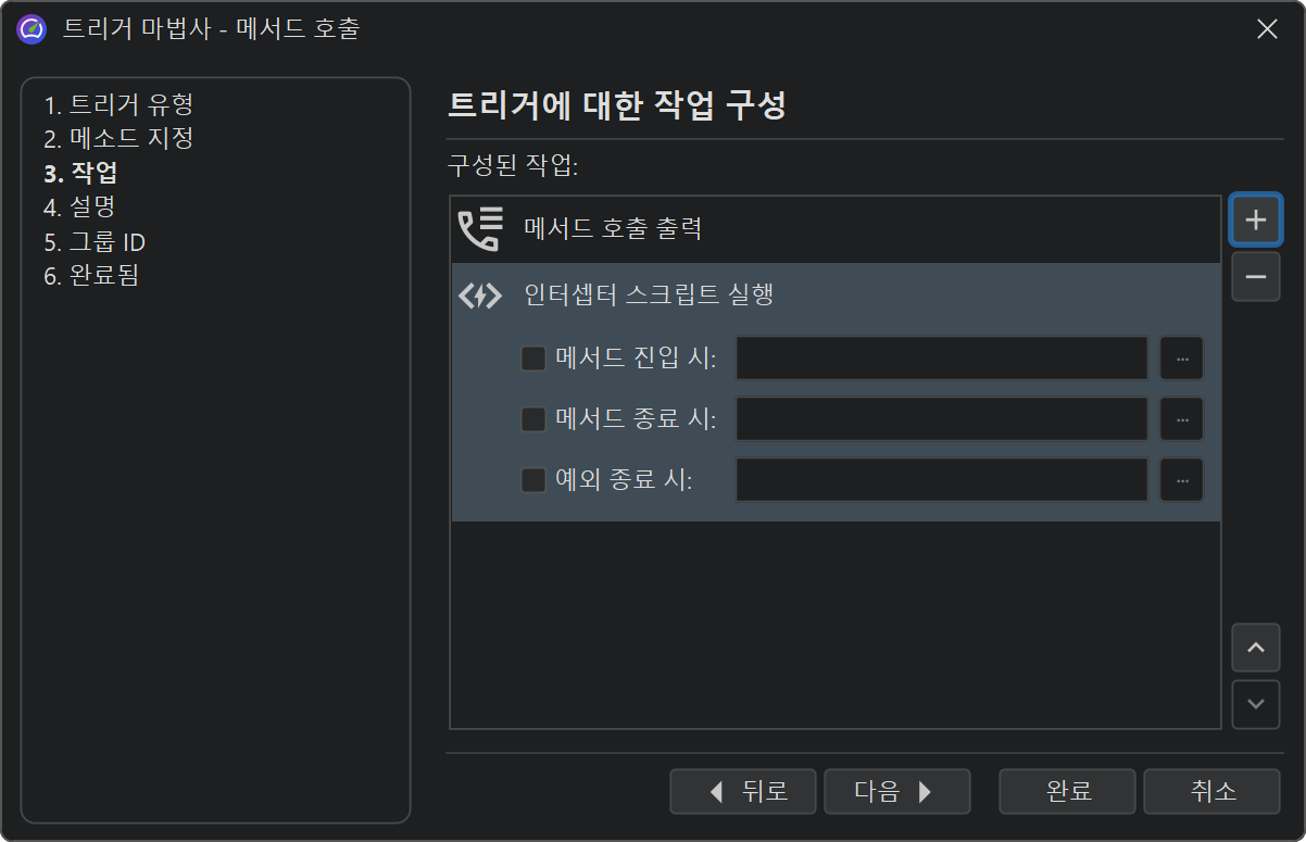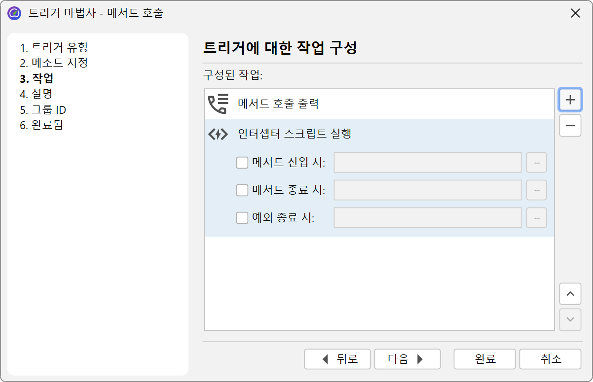 각 트리거에는 관련 이벤트가 발생할 때 수행되는 작업 목록이 있습니다. 이러한 작업 중 일부는 컨트롤러 API의 프로파일링 작업에 해당합니다. 또한, 메소드 호출을 매개변수 및 반환 값과 함께 출력하는 작업이나 메소드에 대한 인터셉터 스크립트를 호출하는 작업과 같은 컨트롤러 기능을 초과하는 다른 작업도 있습니다.