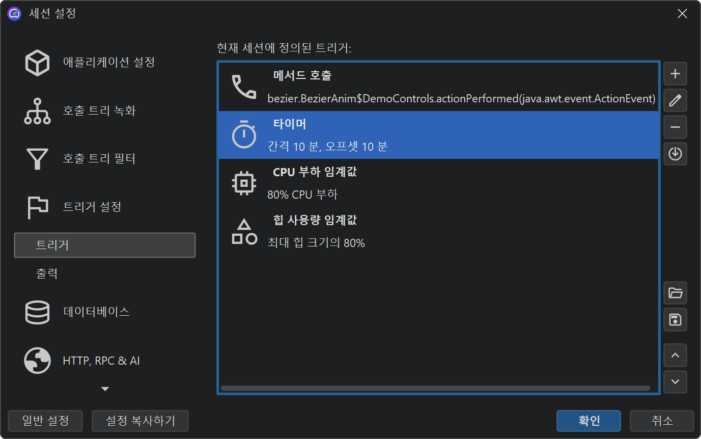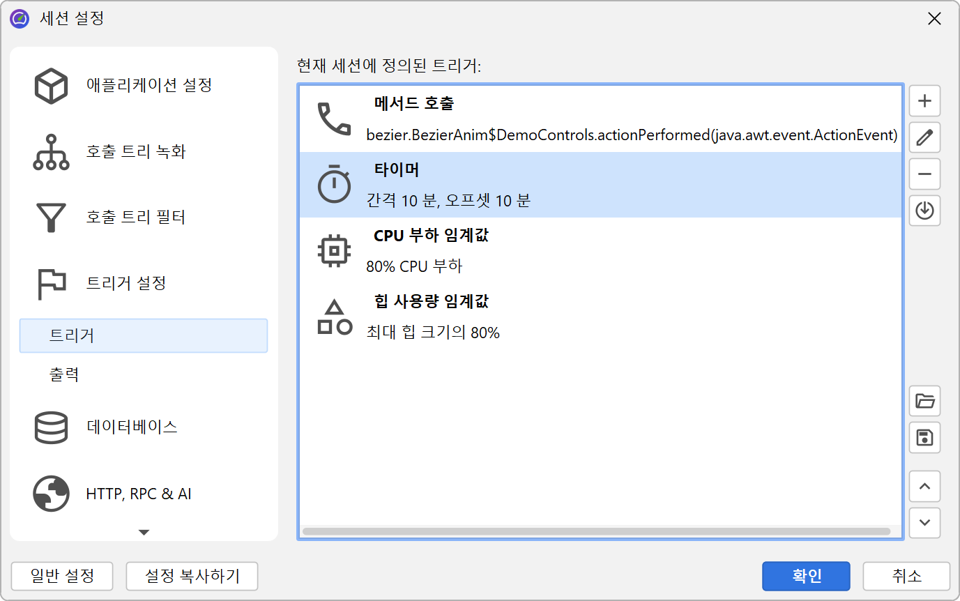 트리거를 사용하면 소스 코드를 수정하지 않고 JProfiler GUI에서 모든 프로파일링 작업을 지정할 수 있습니다. 트리거는 JProfiler 구성 파일에 저장됩니다. 구성 파일과 세션 ID는 오프라인 프로파일링이 활성화된 상태로 시작할 때 명령줄에서 프로파일링 에이전트에 전달되어, 프로파일링 에이전트가 해당 트리거 정의를 읽을 수 있습니다.