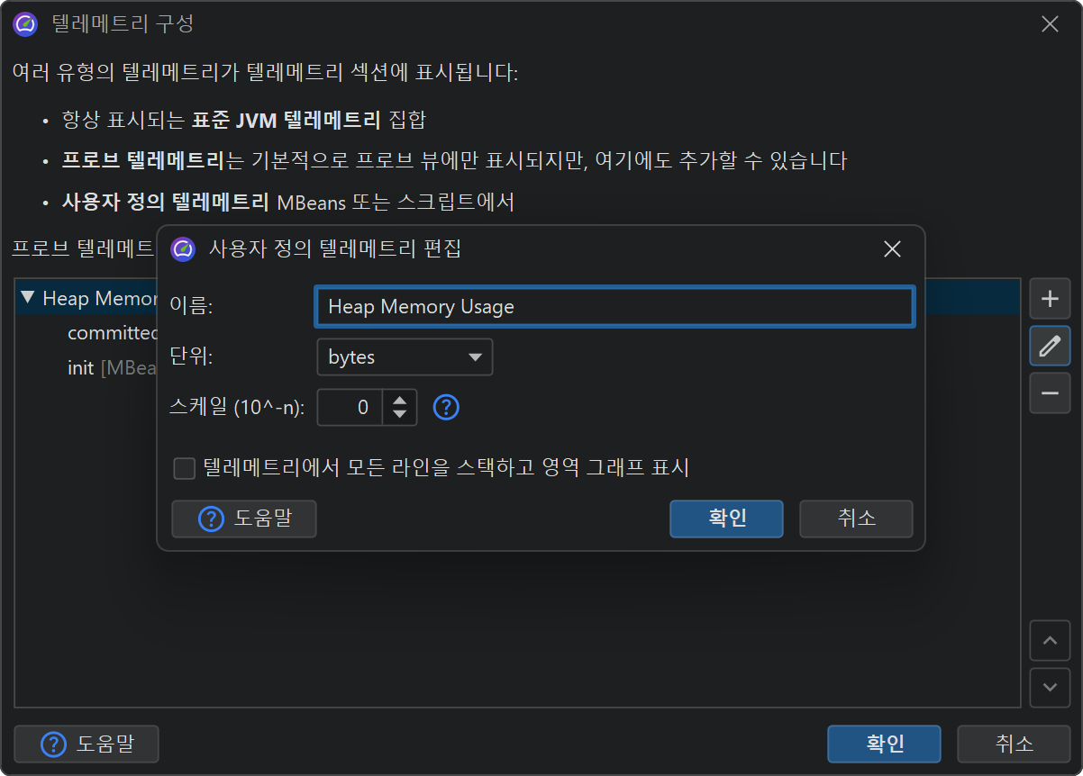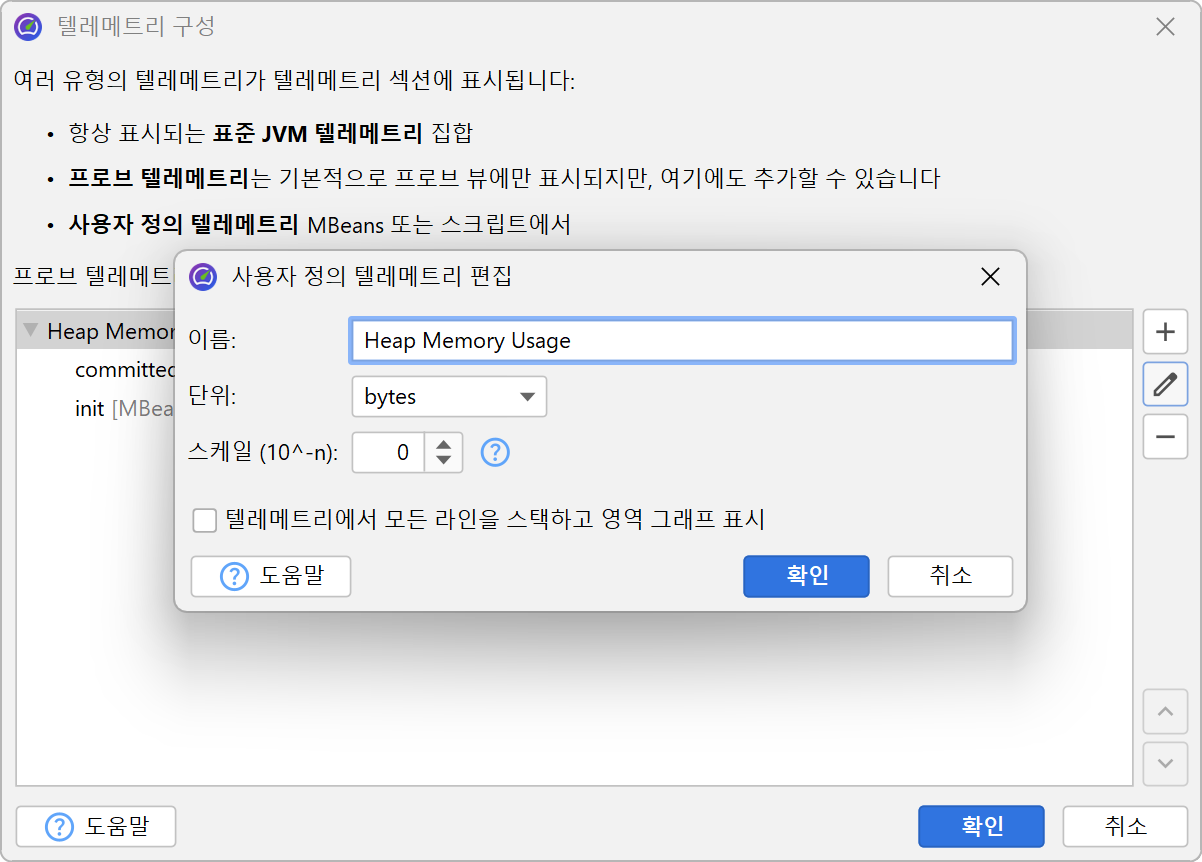 누적(스택) 텔레메트리에서는 각 텔레메트리 라인이 누적되어 영역 그래프로 표시될 수 있습니다. 스케일 팩터는 값을 지원되는 단위로 변환하는 데 유용합니다. 예를 들어, 데이터 소스가 kB를 리포트하는 경우 JProfiler에는 "kB" 단위가 없기 때문에 문제가 발생합니다. 스케일 팩터를 -3으로 설정하면 값이 바이트로 변환되고, 텔레메트리의 단위를 "bytes"로 선택하면 JProfiler가 자동으로 적절한 집계 단위를 표시합니다.