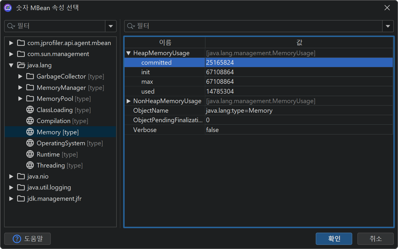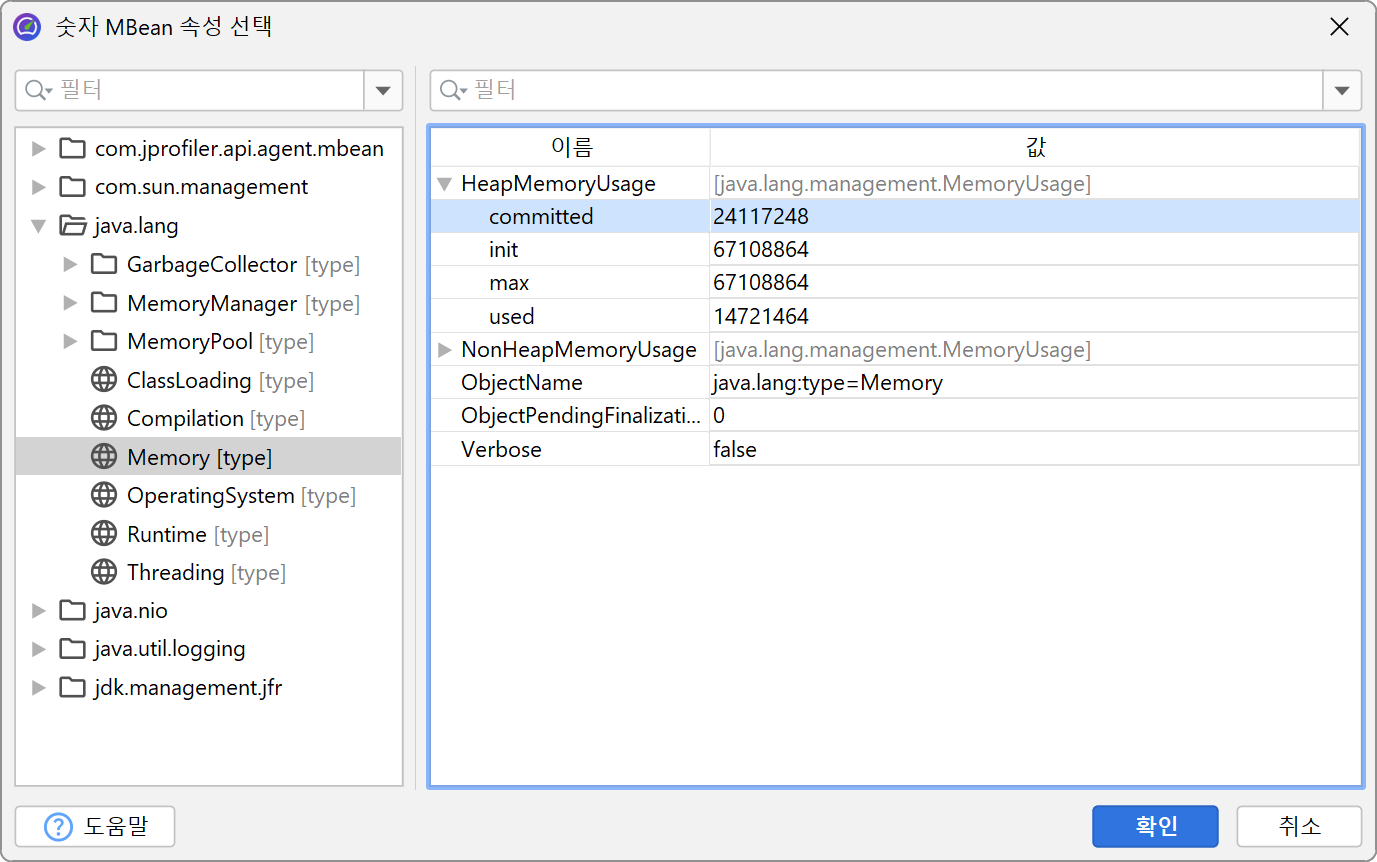 위 예제는 플랫폼 MBean에 대한 호출을 보여줍니다. MBean의 스칼라 값을 그래프로 나타내는 것은 MBean 텔레메트리를 사용하는 것이 더 편리합니다. 여기서는 MBean 브라우저를 통해 적절한 속성을 선택할 수 있습니다. 속성 값은 반드시 숫자형이어야 합니다.