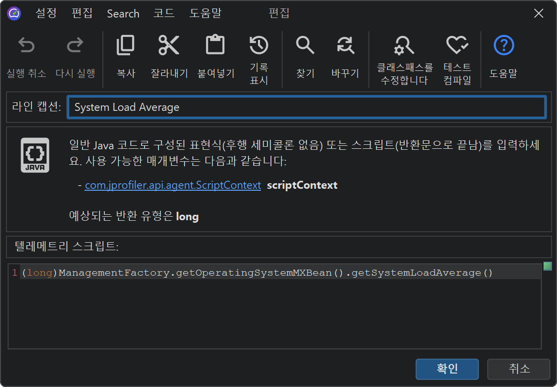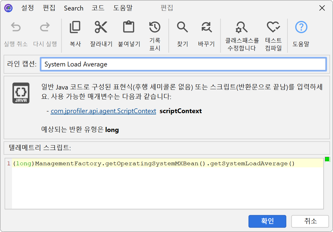사용자 정의 텔레메트리를 추가하려면 "텔레메트리" 섹션에 표시되는 텔레메트리 구성 툴바 버튼을 클릭하세요. 스크립트 텔레메트리에서는 현재 JProfiler 세션의 클래스패스에 설정된 모든 클래스에 접근할 수 있습니다. 값을 직접 얻을 수 없다면, 애플리케이션에 static 메서드를 추가하여 이 스크립트에서 호출할 수 있습니다.