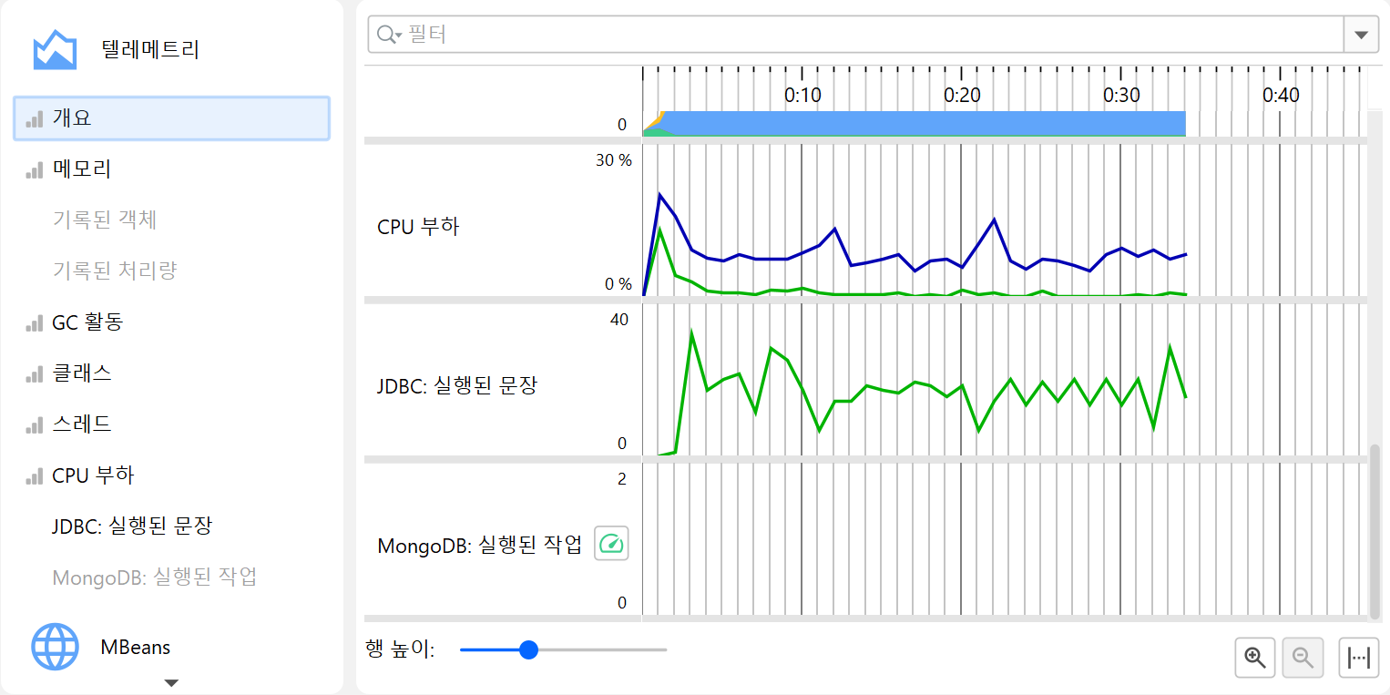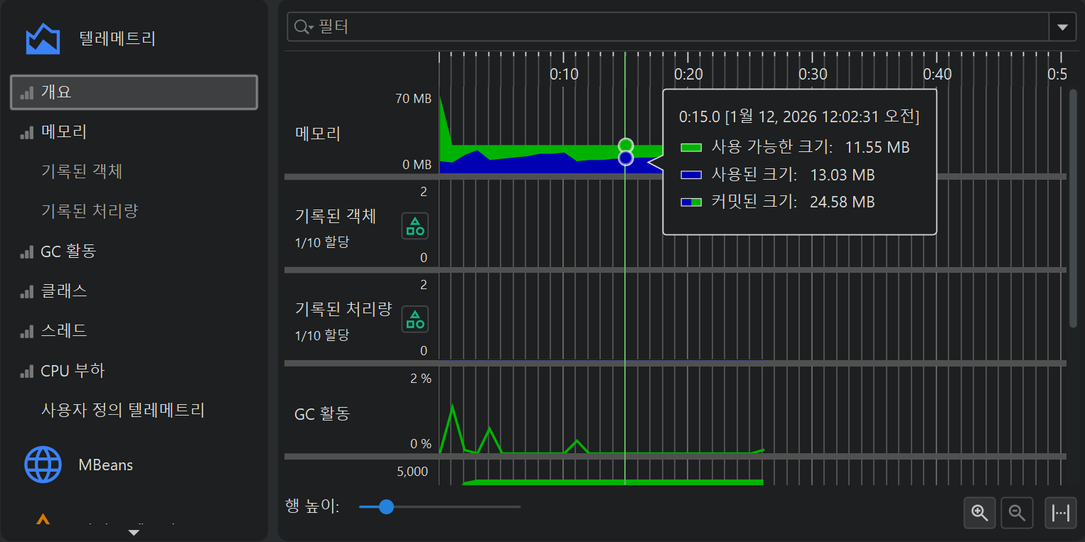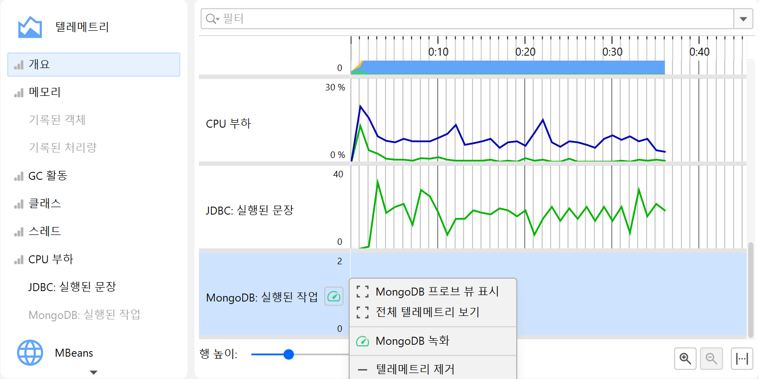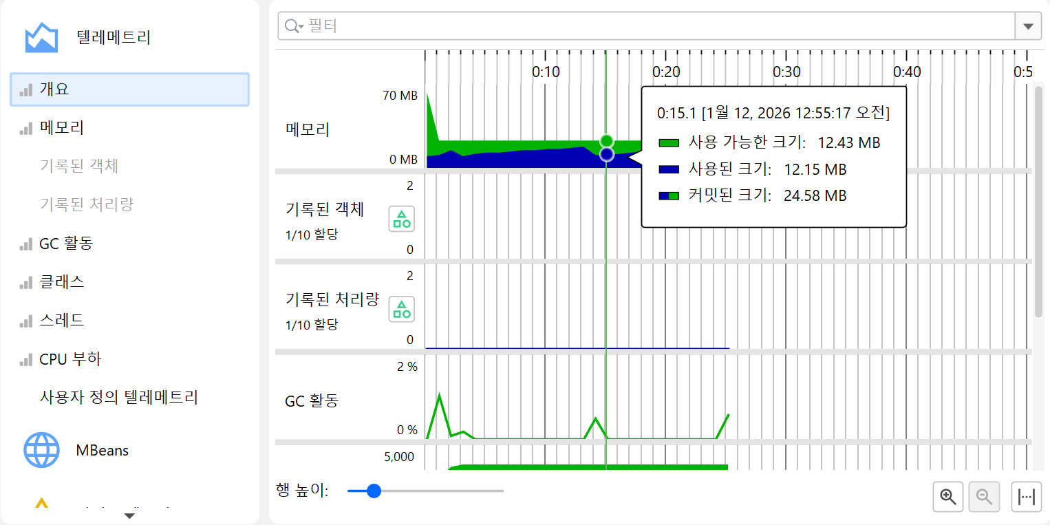 프로파일링의 한 측면은 시간에 따라 스칼라 측정값을 모니터링하는 것입니다. 예를 들어, 사용된 힙 크기 등이 있습니다. JProfiler에서는 이러한 그래프를 텔레메트리라고 부릅니다. 텔레메트리를 관찰하면 프로파일된 소프트웨어에 대한 이해도를 높일 수 있고, 서로 다른 측정값에서 중요한 이벤트를 연관지어 볼 수 있으며, 예기치 않은 동작이 감지될 경우 JProfiler의 다른 뷰에서 더 깊은 분석을 수행하도록 유도할 수 있습니다.