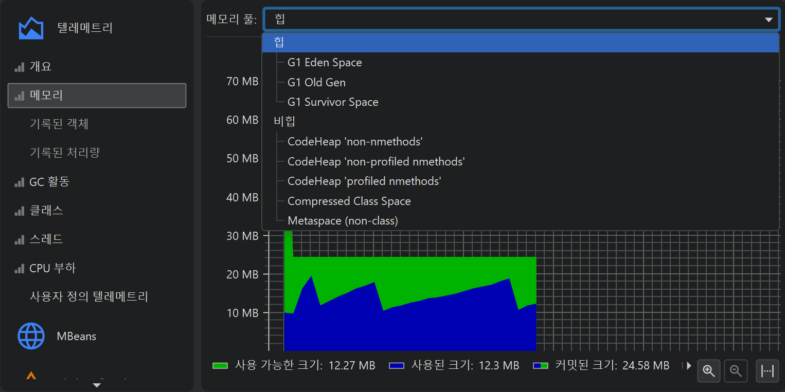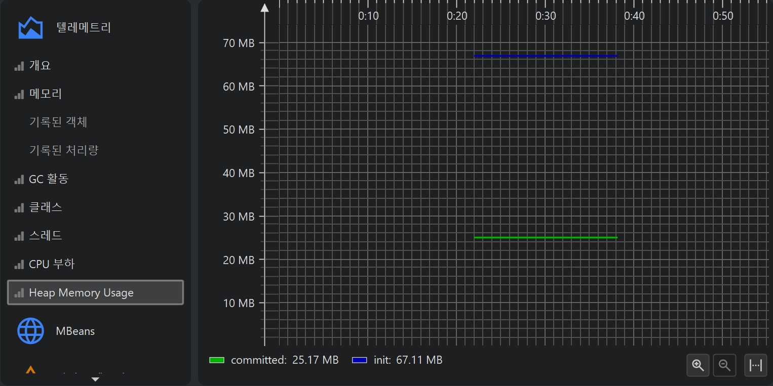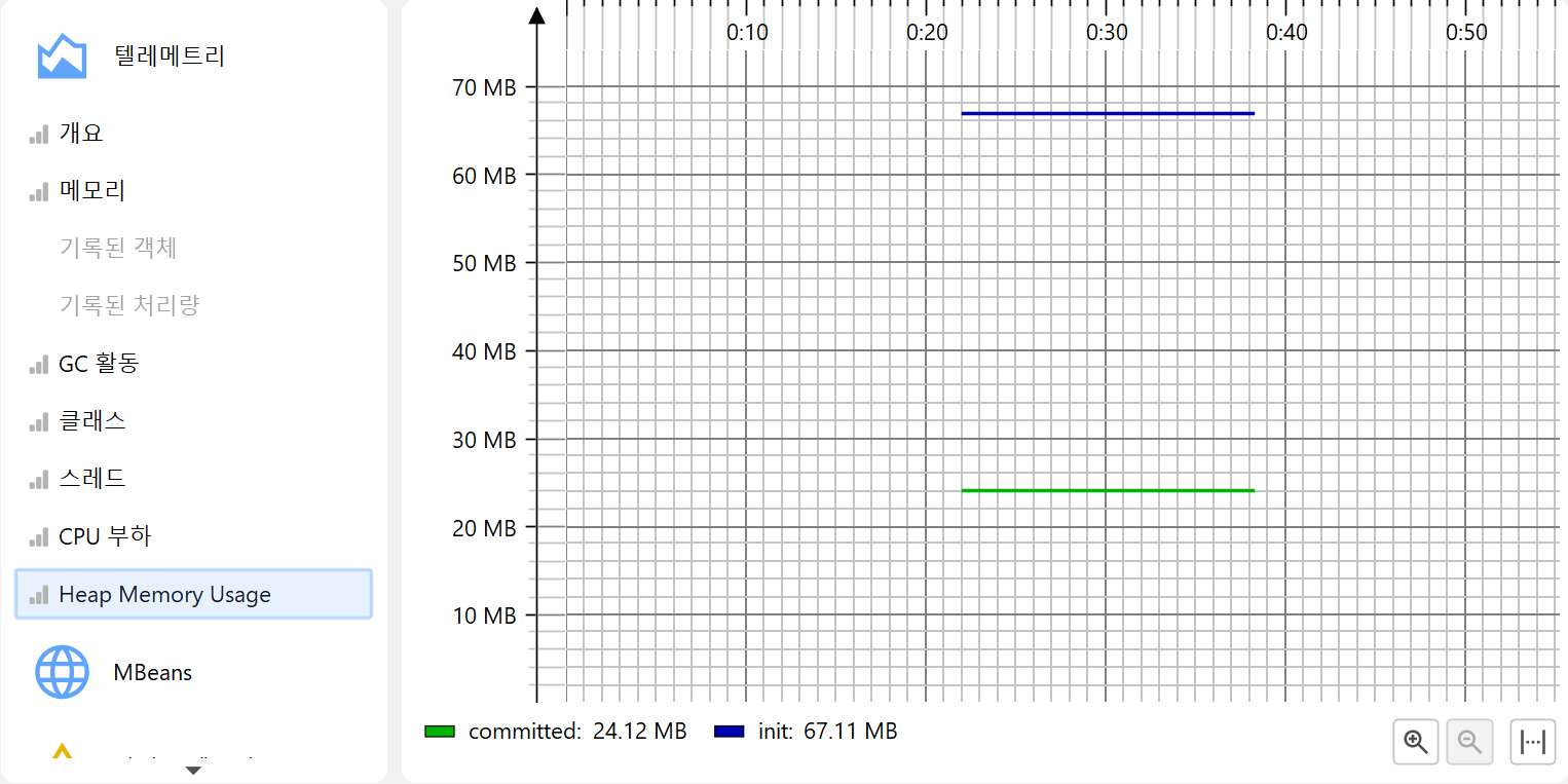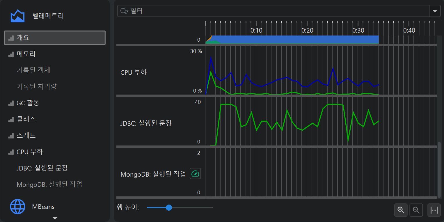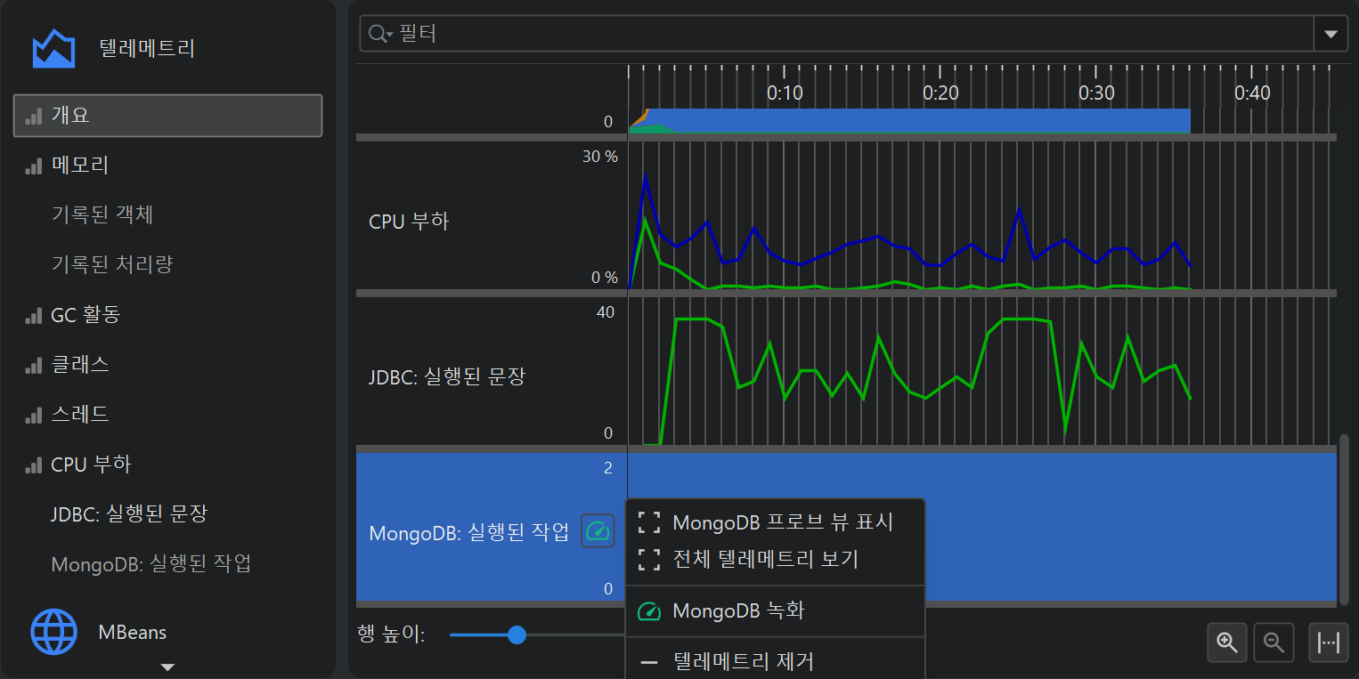 프로파일링의 한 측면은 시간에 따라 스칼라 측정값을 모니터링하는 것입니다. 예를 들어, 사용된 힙 크기 등이 있습니다. JProfiler에서는 이러한 그래프를 텔레메트리라고 부릅니다. 텔레메트리를 관찰하면 프로파일된 소프트웨어에 대한 이해도를 높일 수 있고, 서로 다른 측정값에서 중요한 이벤트를 연관지어 볼 수 있으며, 예기치 않은 동작이 감지될 경우 JProfiler의 다른 뷰에서 더 깊은 분석을 수행하도록 유도할 수 있습니다.