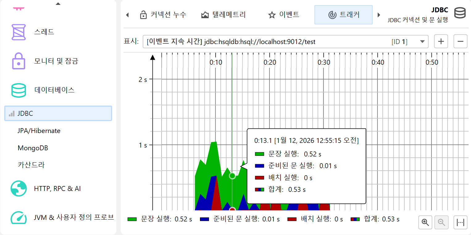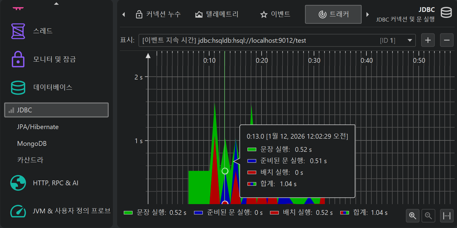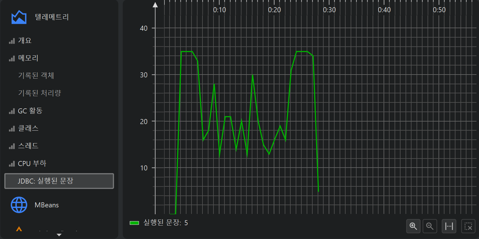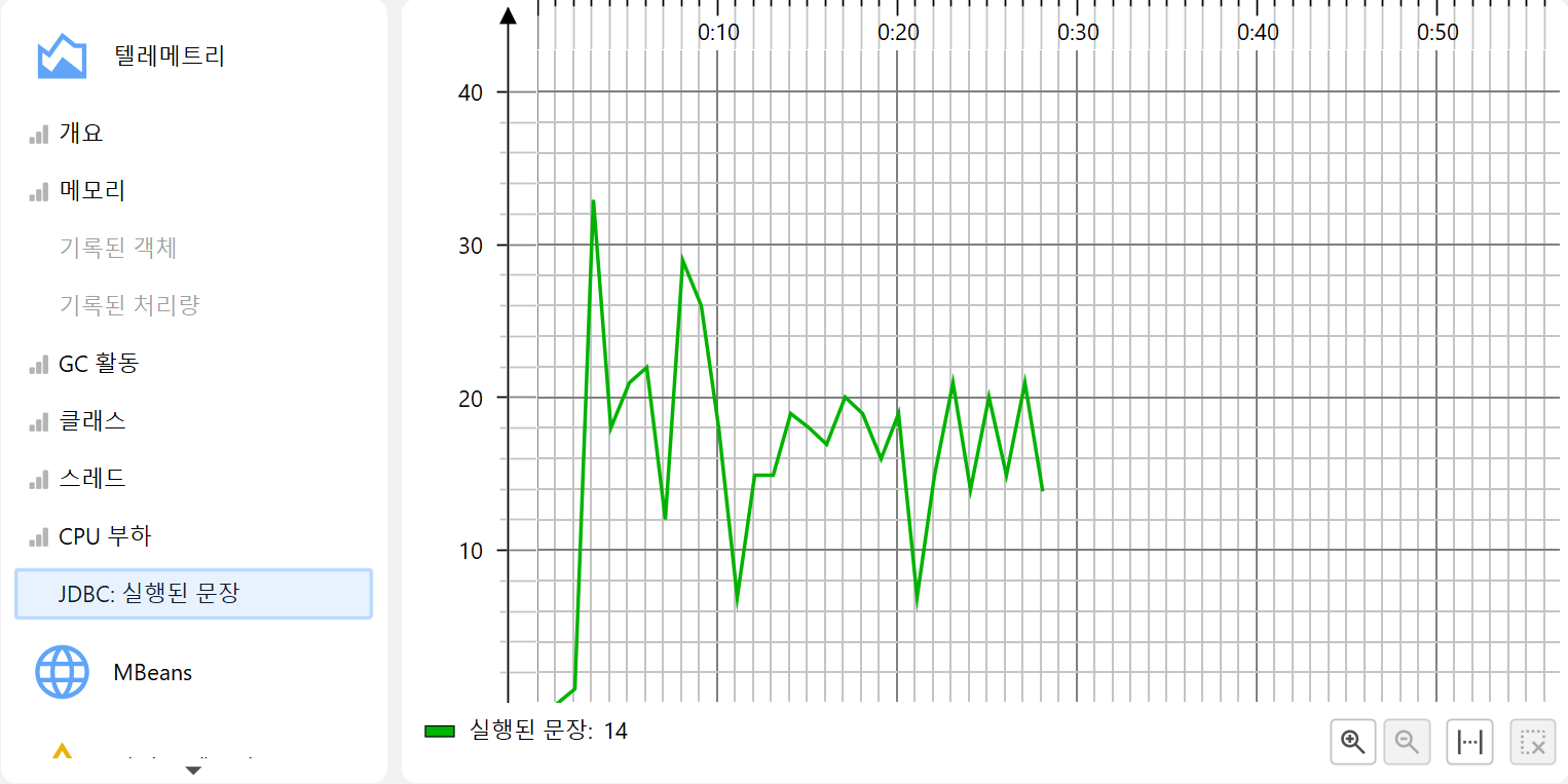 프로파일링의 한 측면은 시간에 따라 스칼라 측정값을 모니터링하는 것입니다. 예를 들어, 사용된 힙 크기 등이 있습니다. JProfiler에서는 이러한 그래프를 텔레메트리라고 부릅니다. 텔레메트리를 관찰하면 프로파일된 소프트웨어에 대한 이해도를 높일 수 있고, 서로 다른 측정값에서 중요한 이벤트를 연관지어 볼 수 있으며, 예기치 않은 동작이 감지될 경우 JProfiler의 다른 뷰에서 더 깊은 분석을 수행하도록 유도할 수 있습니다.