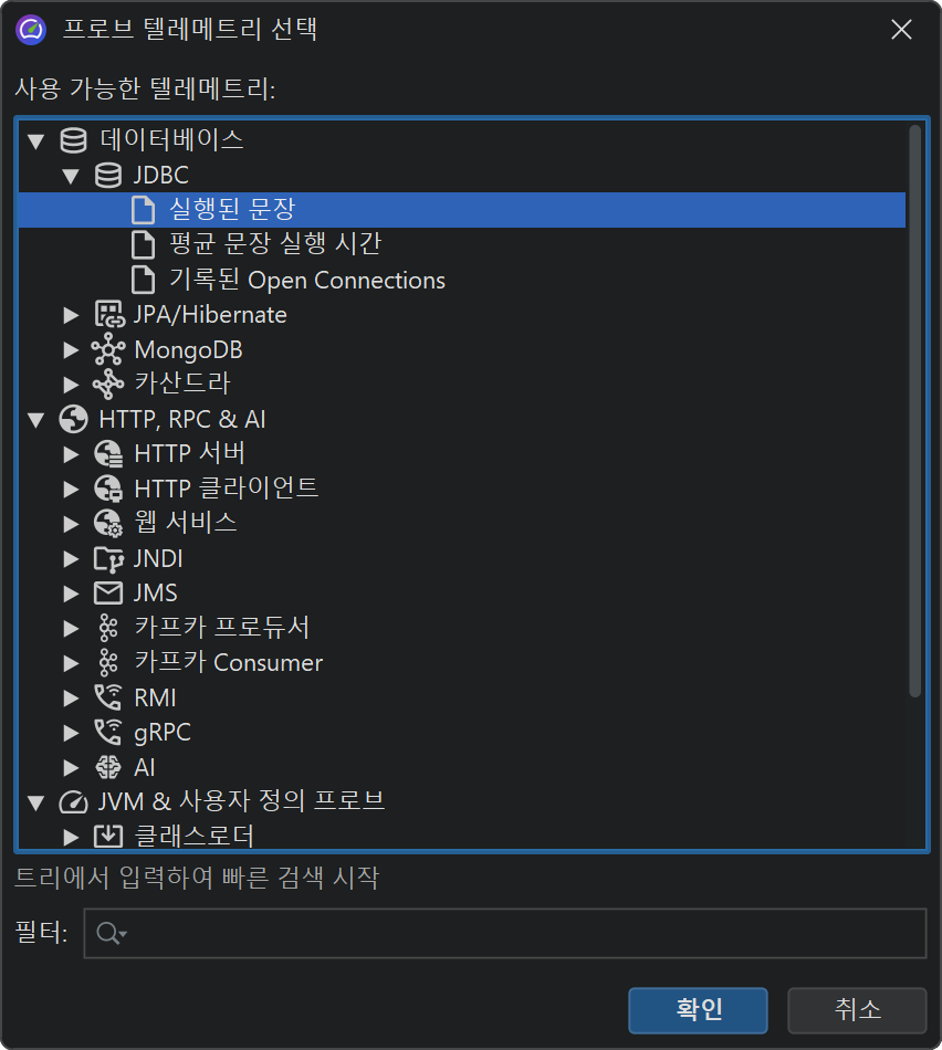 JProfiler에는 JVM의 상위 시스템 및 주요 프레임워크에서 이벤트를 기록하는 프로브가 다수 존재합니다. 프로브에는 해당 프로브 뷰에 표시되는 텔레메트리가 있습니다. 이러한 텔레메트리를 시스템 텔레메트리와 비교하려면, 선택한 프로브 텔레메트리를 최상위 텔레메트리 섹션에 추가할 수 있습니다. 툴바에서 텔레메트리 추가→프로브 텔레메트리 를 선택하고 하나 이상의 프로브 텔레메트리를 선택하세요.