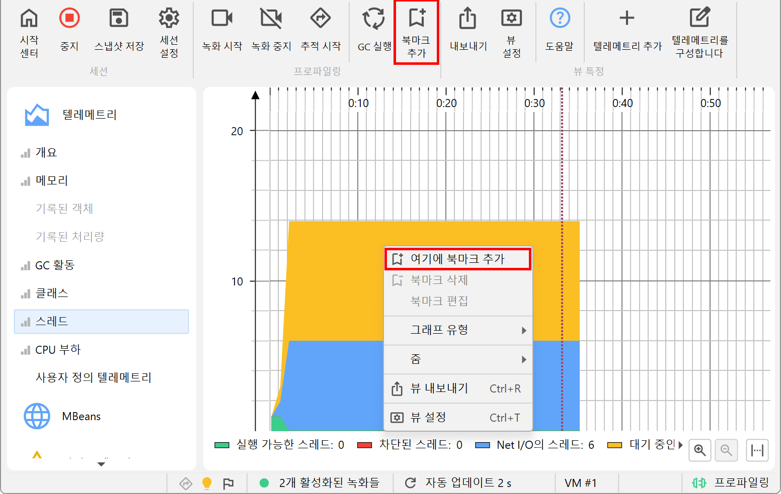 JProfiler는 모든 텔레메트리에 표시되는 북마크 목록을 관리합니다. 인터랙티브 세션에서는 북마크 추가 툴바 버튼을 클릭하거나, 컨텍스트 메뉴의 여기에 북마크 추가 기능을 사용하여 현재 시점에 북마크를 추가할 수 있습니다.