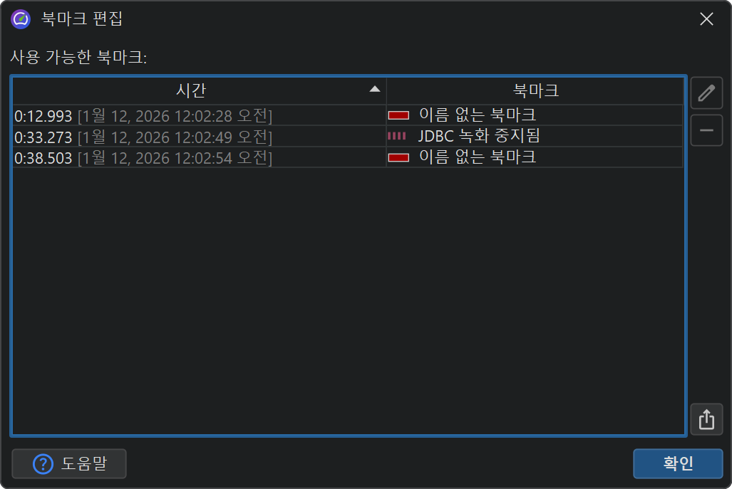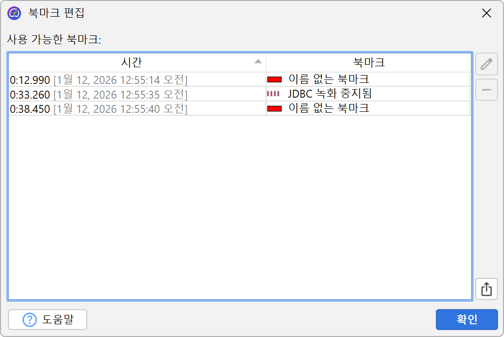 텔레메트리에서 여러 북마크를 우클릭하는 것이 번거롭다면, 프로파일링→북마크 편집 메뉴 액션을 사용하여 북마크 목록을 확인할 수 있습니다. 이곳에서 북마크를 HTML 또는 CSV로 내보낼 수도 있습니다.
