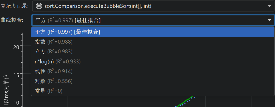 如果至少有3个数据点,将显示一个具有常见复杂性的曲线拟合。JProfiler尝试从几个常见复杂性中进行曲线拟合,并最初向您显示最佳拟合。曲线拟合的下拉菜单还允许您显示其他曲线拟合模型。嵌入在曲线拟合描述中的R2值显示了拟合的好坏。下拉菜单中的模型按R2降序排列,因此最佳模型始终是第一个项目。