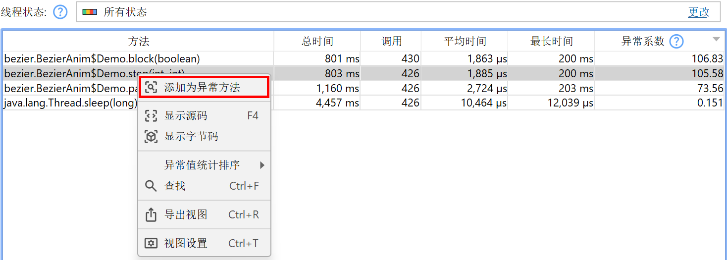 一旦你确定某个方法存在异常调用耗时,可以通过右键菜单将其添加为异常方法 (exceptional method)。同样的菜单操作也可以在调用树 (call tree) 视图 (view) 中使用。