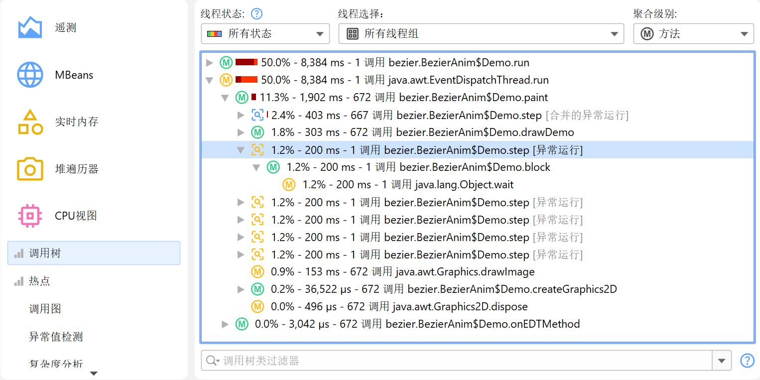 在某些情况下,问题并不是方法的平均调用时间过长,而是该方法偶尔会出现异常行为。在调用树 (call tree) 中,所有方法调用都会被累计,因此一个被频繁调用的方法即使每 10000 次调用中有一次耗时比预期多 100 倍,也不会在总耗时中留下明显的痕迹。