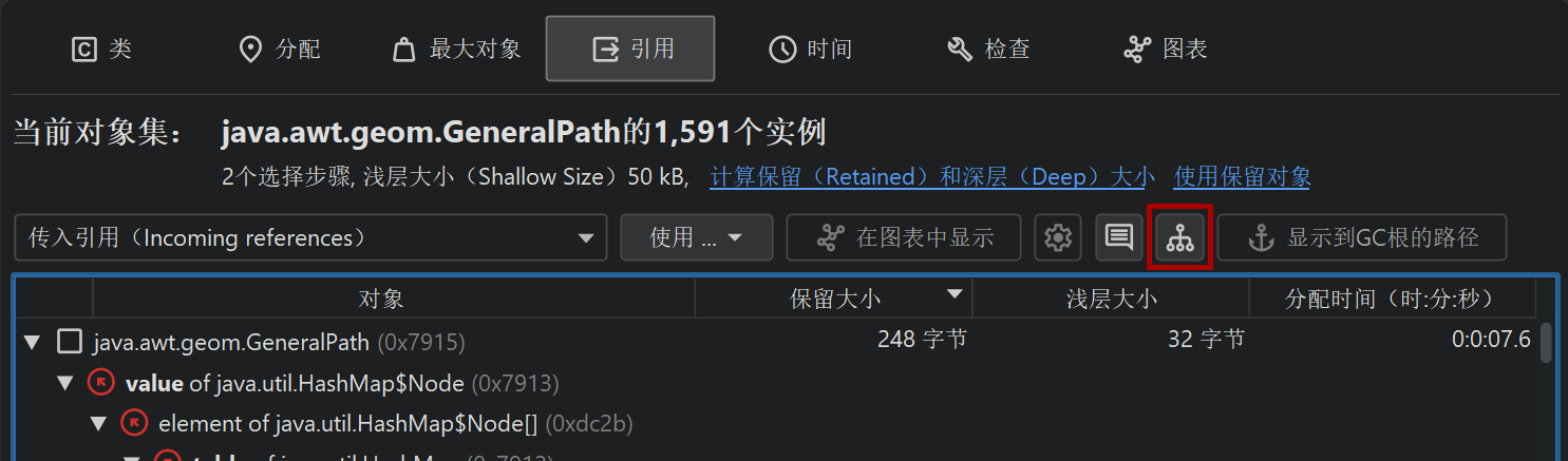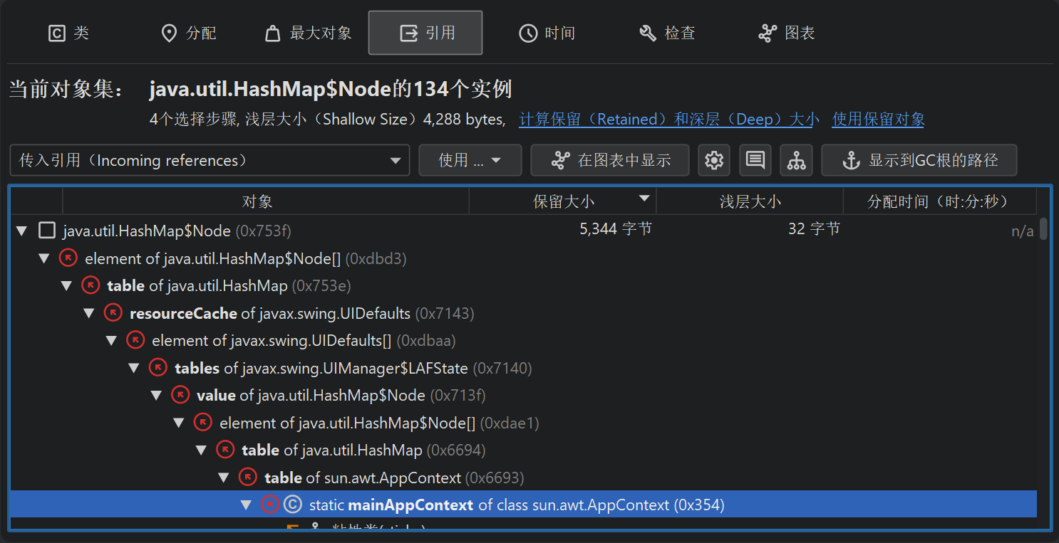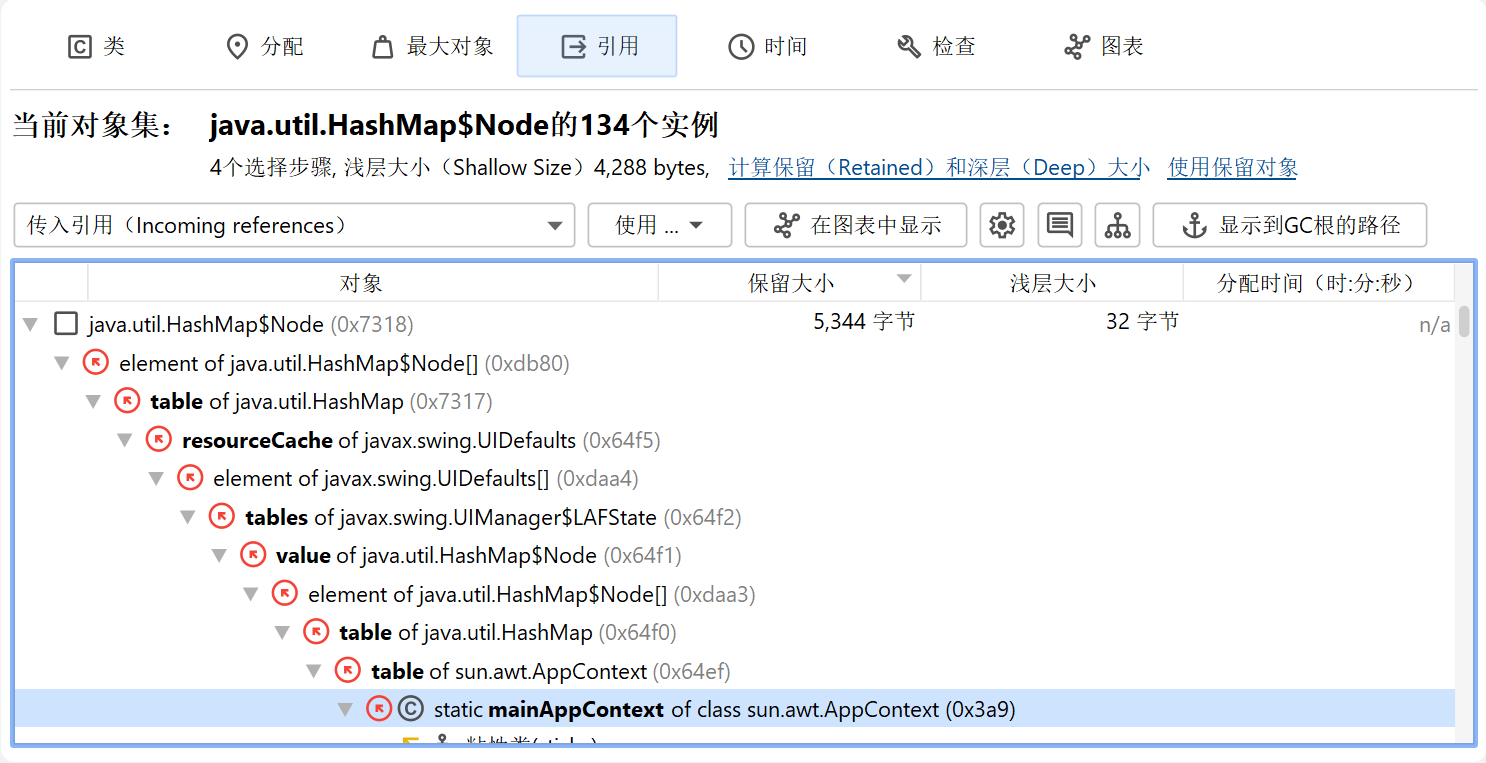 要查找从GC根到引用链,您可以使用"传入引用"视图或堆漫游器图中的显示到GC根的路径操作。这样的引用链在实践中可能非常长,因此通常可以在"传入引用"视图中更容易地解释。引用从底部指向顶层的对象。只有搜索结果的引用链被展开,同一层次上的其他引用在节点关闭并重新打开或在上下文菜单中调用显示所有传入引用操作之前不可见。