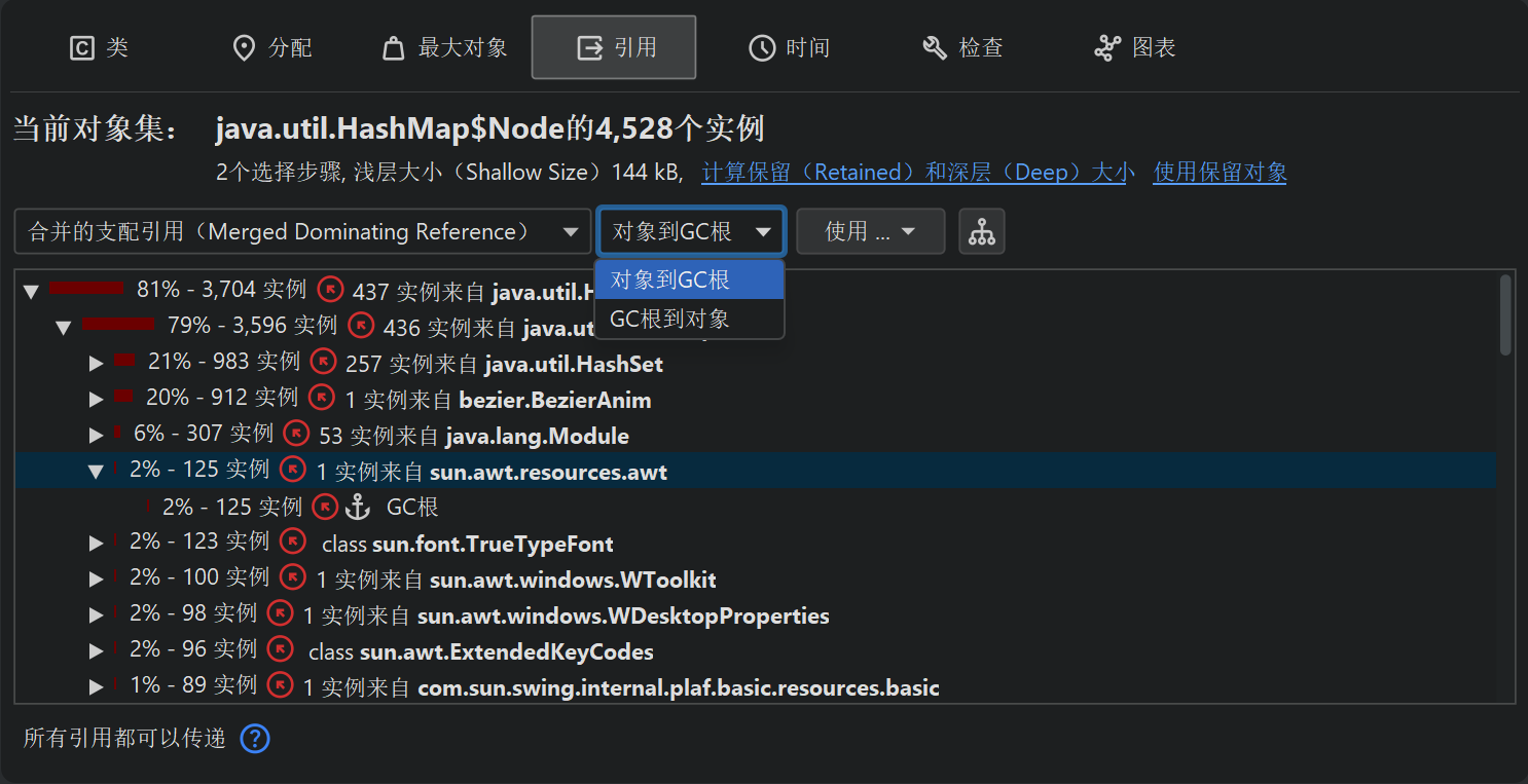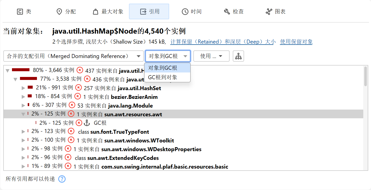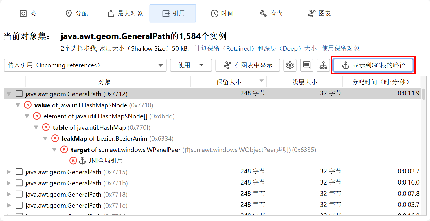 要查找从GC根到引用链,您可以使用"传入引用"视图或堆漫游器图中的显示到GC根的路径操作。这样的引用链在实践中可能非常长,因此通常可以在"传入引用"视图中更容易地解释。引用从底部指向顶层的对象。只有搜索结果的引用链被展开,同一层次上的其他引用在节点关闭并重新打开或在上下文菜单中调用显示所有传入引用操作之前不可见。