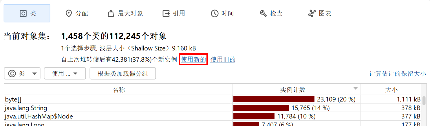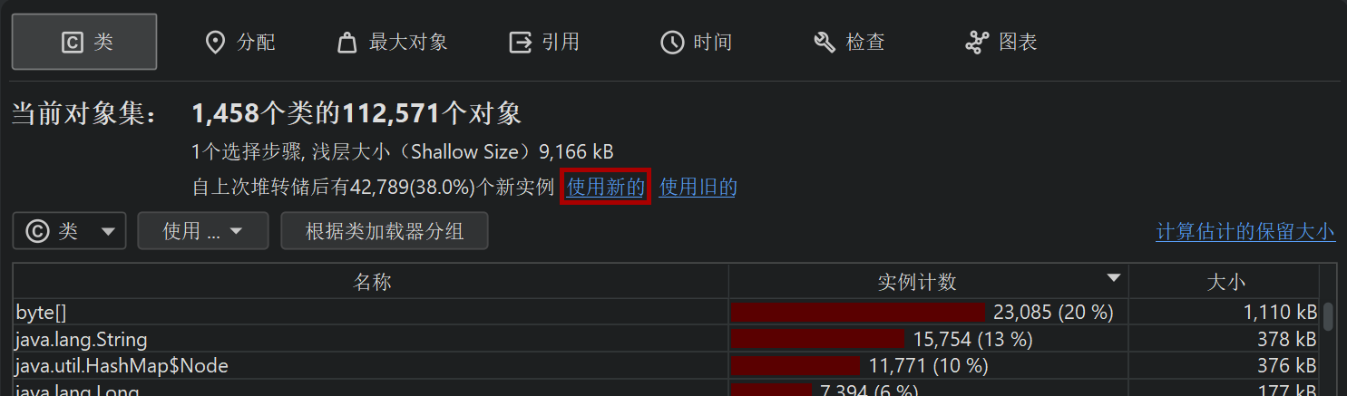 如果内存泄漏填满了可用堆,它将使被分析应用程序中的其他类型内存使用显得微不足道。在这种情况下,您无需检查新对象,只需分析哪些对象最为重要。