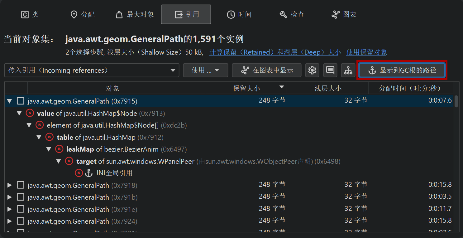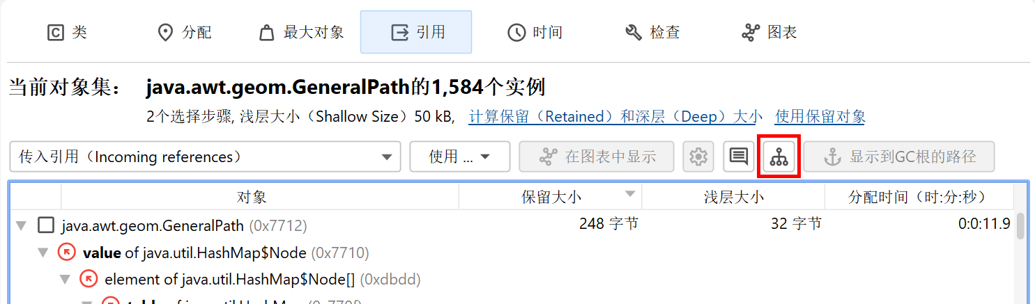 支配引用树中的每个节点都会告诉您,如果消除该引用,当前对象集中有多少对象将有资格进行垃圾收集。由多个垃圾收集器根引用的对象可能没有任何支配的传入引用,因此该视图可能只对一部分对象有帮助,或者甚至可能为空。在这种情况下,您必须使用合并传入引用视图并逐个消除垃圾收集器根。