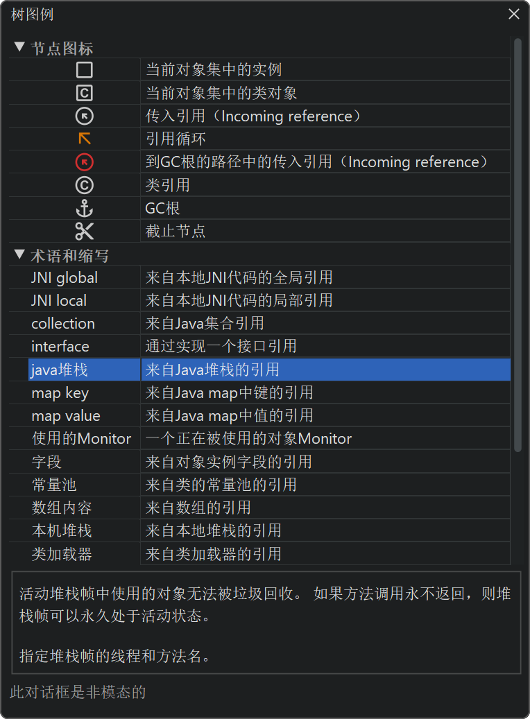 要获取GC根类型和引用节点中使用的其他术语的解释,请使用树图例。