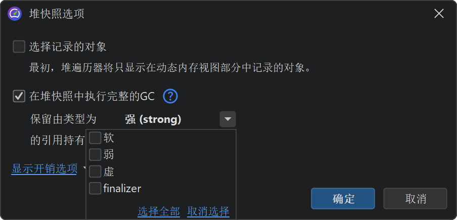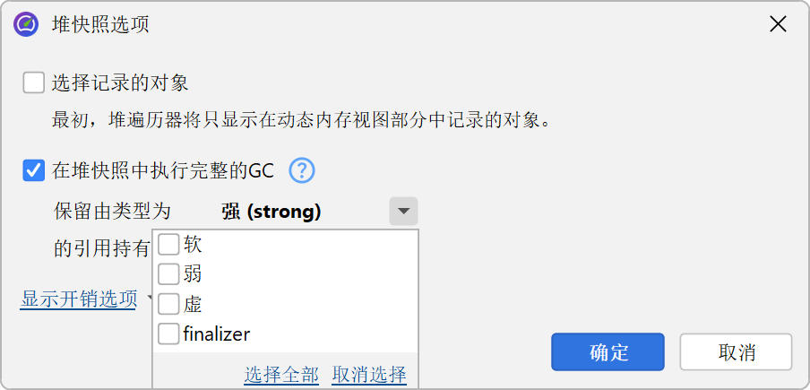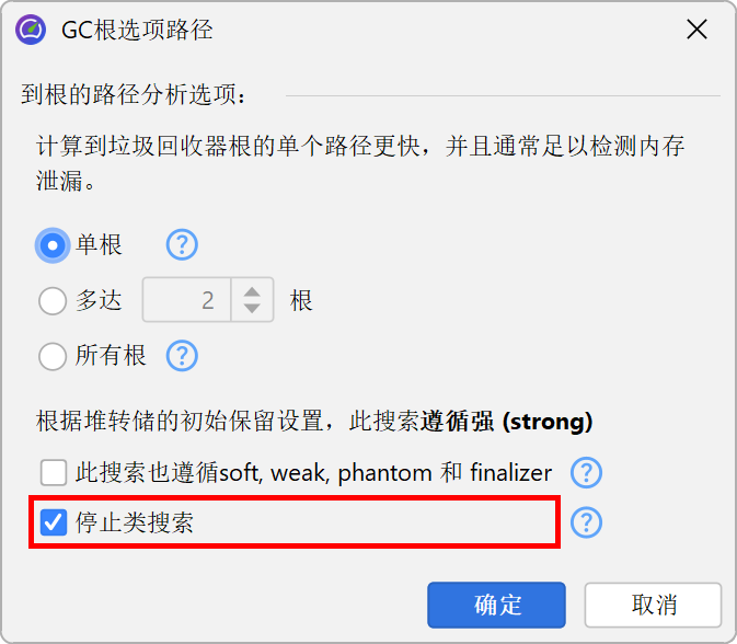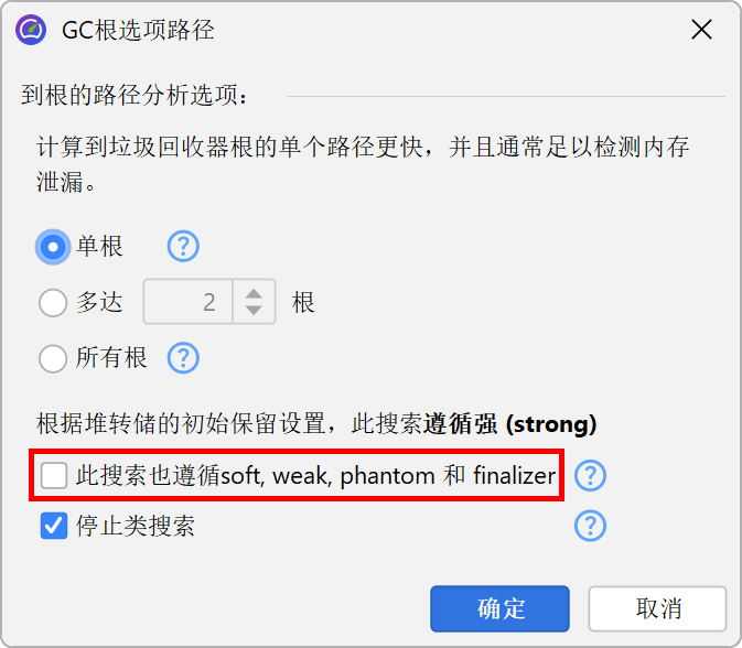 在搜索到GC根的路径时,堆漫游器选项对话框中选择的保留对象的引用类型会被考虑在内。这样,路径到GC根搜索始终可以解释为什么对象在堆漫游器中被保留。在路径到GC根搜索的选项对话框中,您可以将可接受的引用类型扩展到所有弱引用。