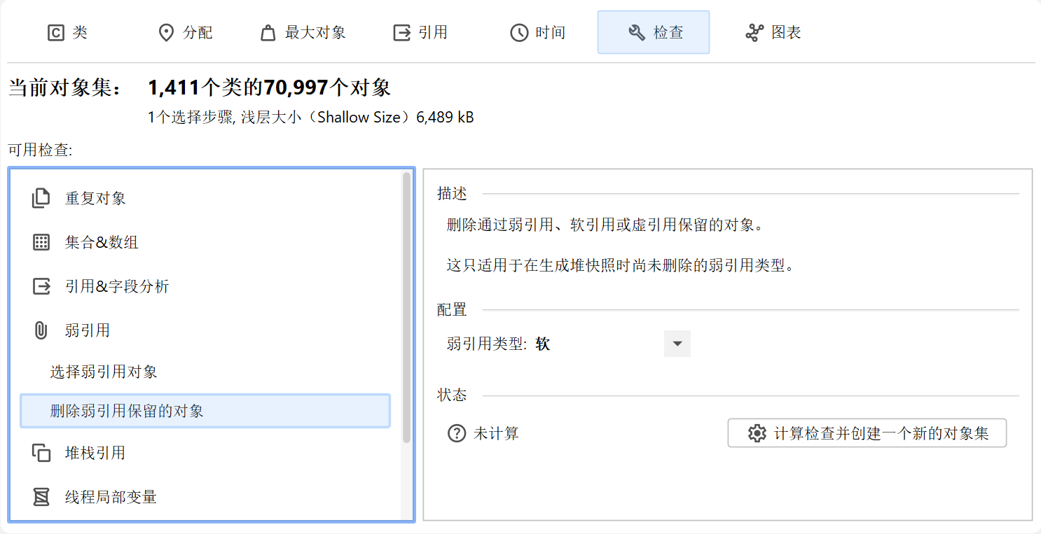 在堆漫游器中拥有弱引用的对象可能对调试目的很有趣。如果您想稍后删除弱引用的对象,可以使用"移除由弱引用保留的对象"检查。
