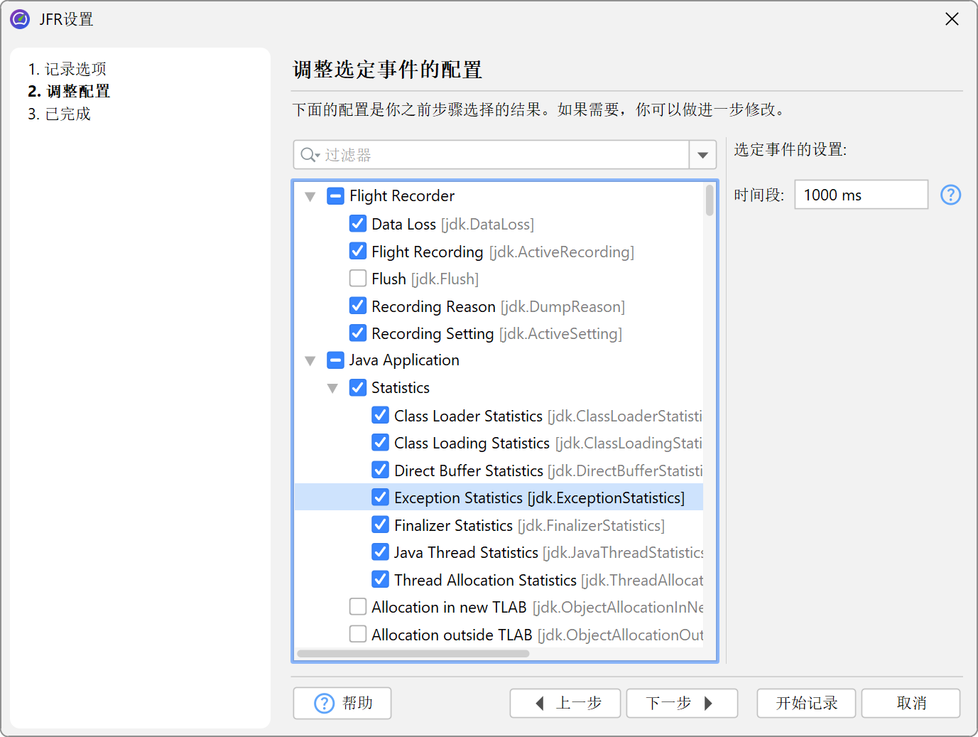如果您已经为具有相同事件类型集的JVM启动了JFR记录,JProfiler将为您提供使用上次设置的选项。