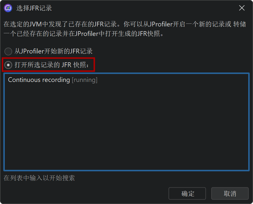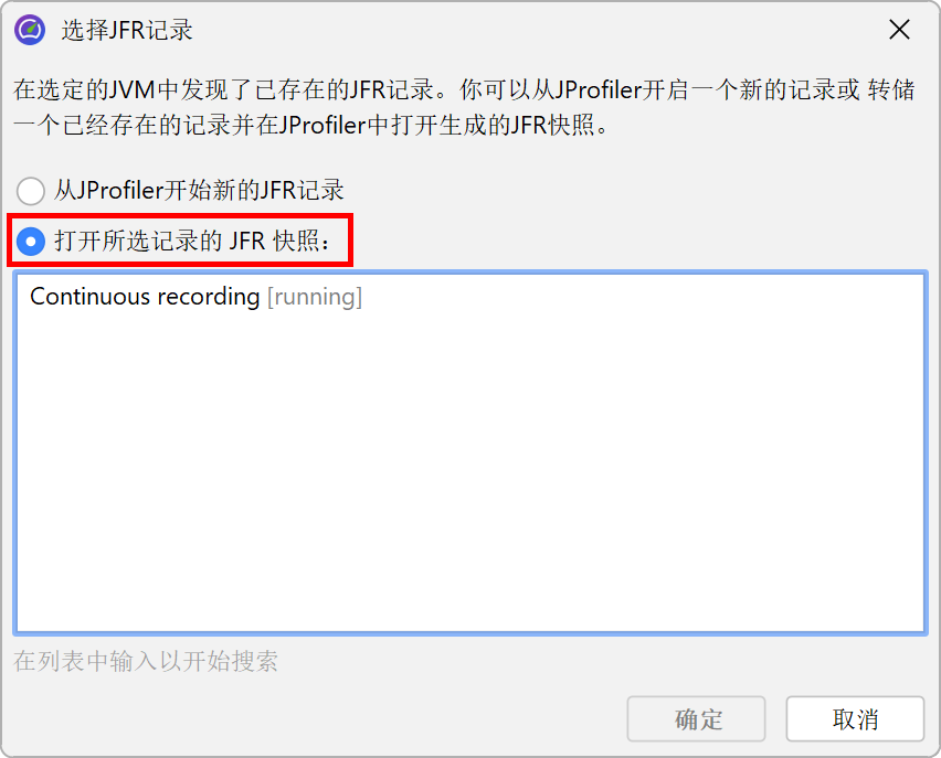 JVM表中的特殊背景颜色指示JFR记录正在运行仅指的是在JProfiler中启动的JFR记录。 如果您连接到通过其他方式启动JFR记录的JVM,将显示另一个对话框。