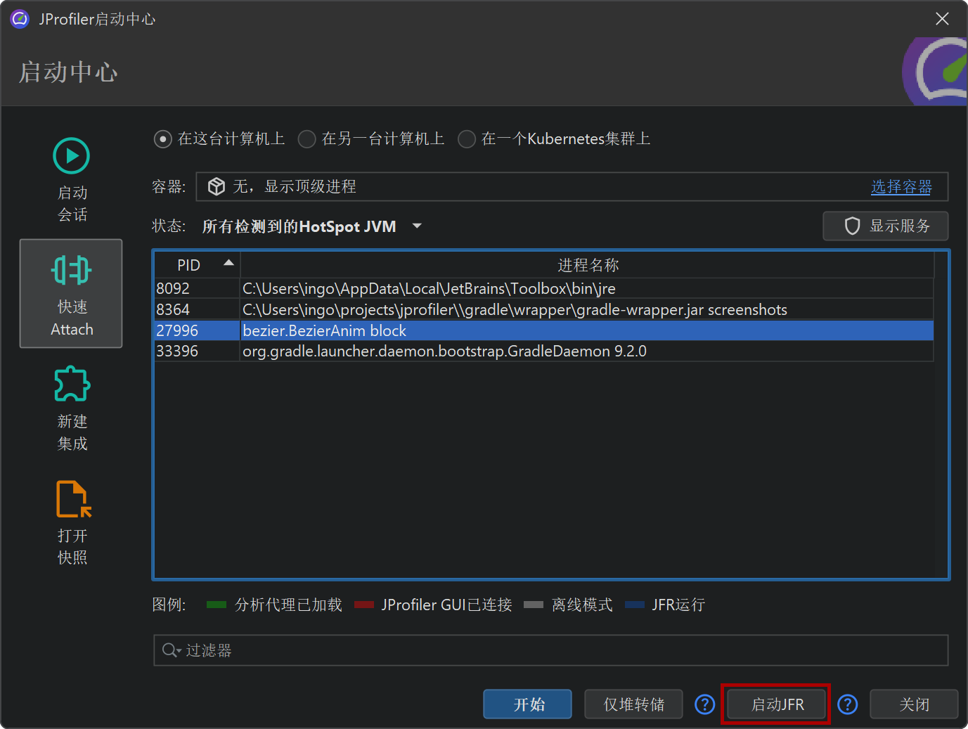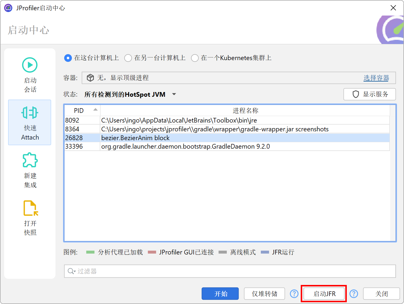 在启动中心的"Quick attach"选项卡上,选择一个JVM并点击对话框底部的Start JFR按钮。 屏幕截图中显示的是本地运行的JVM,但当您附加到远程JVM时,同样的按钮也可用。