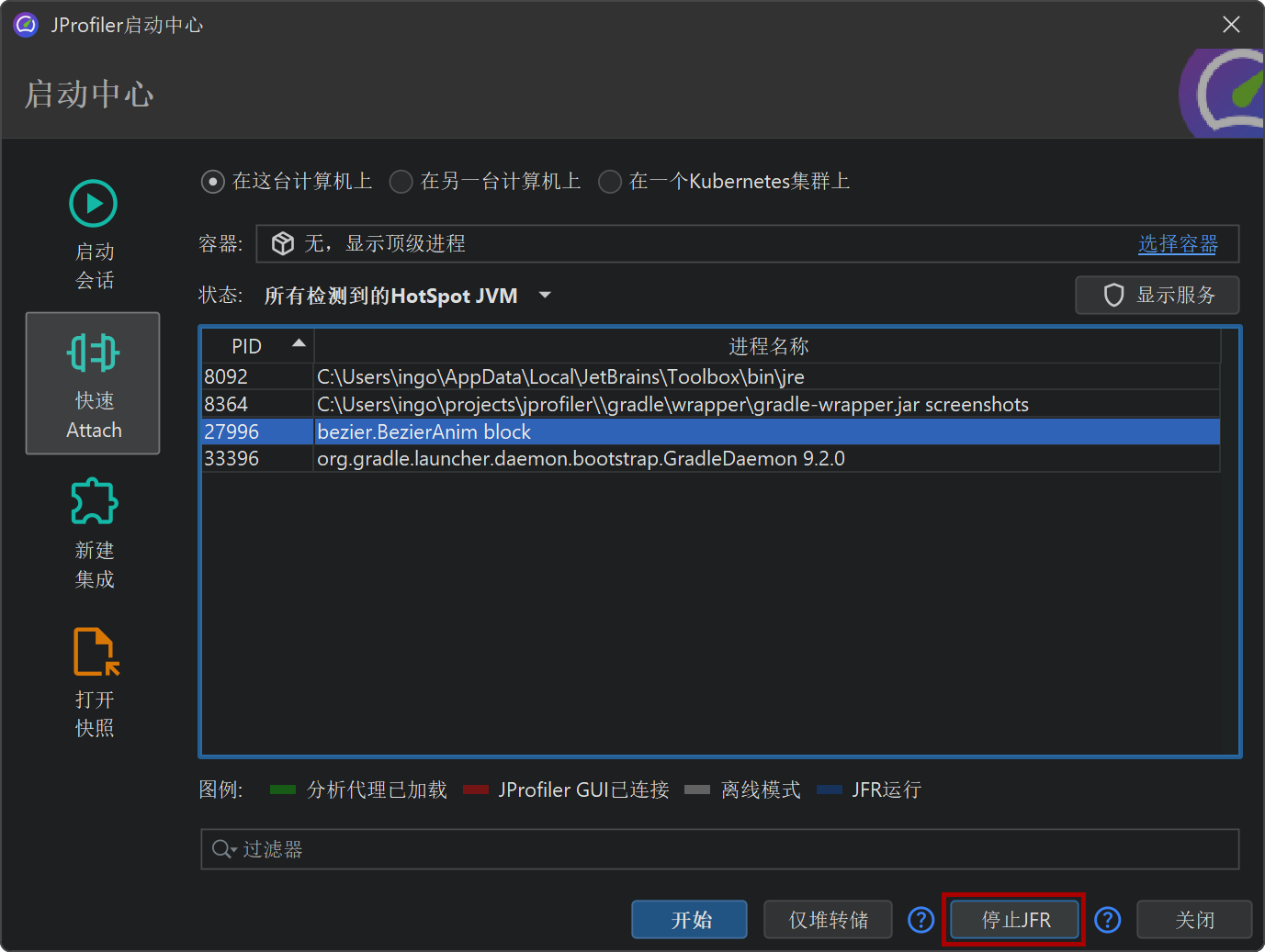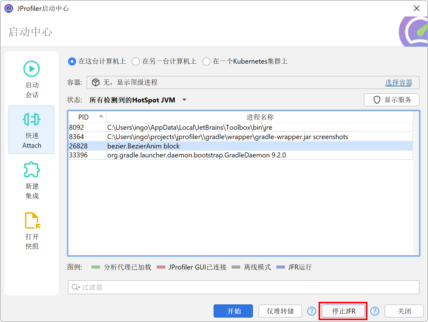 与完整分析模式或"Heap dump only"模式不同,在这些模式下,您可以立即在UI中看到一些数据,启动JFR快照仅会在未选择时修改JVM在表中的背景颜色, 以便您可以看到JProfiler已开始记录。当选择JVM时,底部的JFR按钮文本现在会显示您将停止记录。
