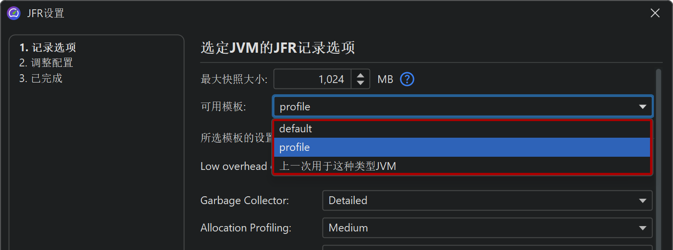 在JFR设置向导中,您可以选择从所选进程使用的JRE的lib/jfr目录中传输的事件设置模板之一。