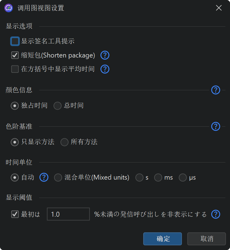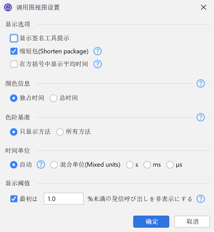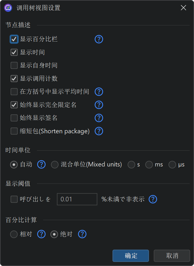调用树中的百分比条显示总耗时 (total time),但自耗时 (self-time) 部分会用不同颜色显示。方法默认不显示签名,除非同一层级有重载方法。你可以在视图设置对话框中自定义调用树节点的显示方式。例如,可以选择显示自耗时 (self-time) 或平均时间为文本、始终显示方法签名或更改时间刻度。百分比计算也可以基于父节点时间,而不是整个调用树的时间。