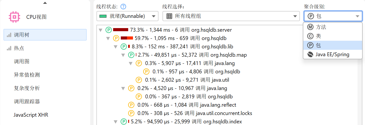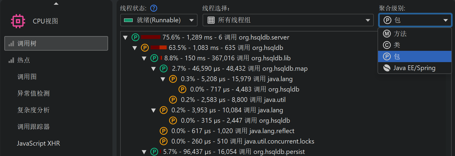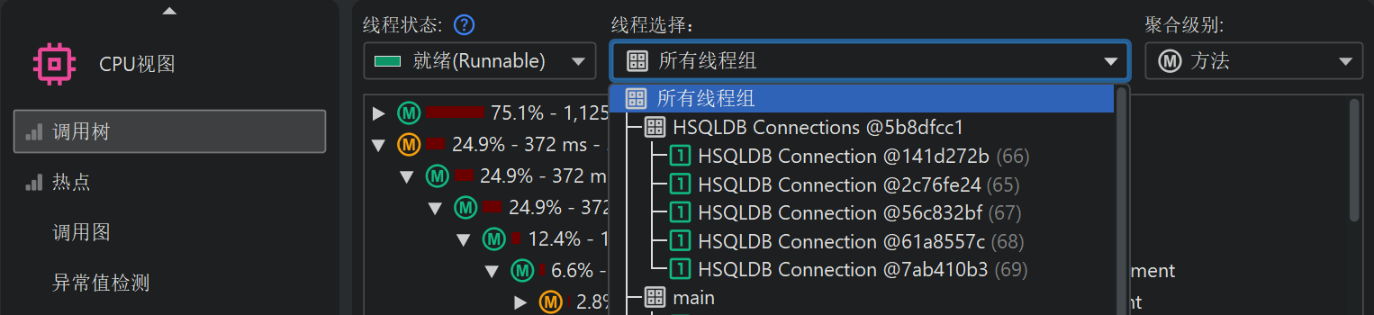 在调用树顶部有多个视图参数,可以更改显示分析数据的类型和范围。默认情况下,所有线程都会被累积统计。JProfiler 会为每个线程维护 CPU 数据,你也可以选择显示单个线程或线程组。