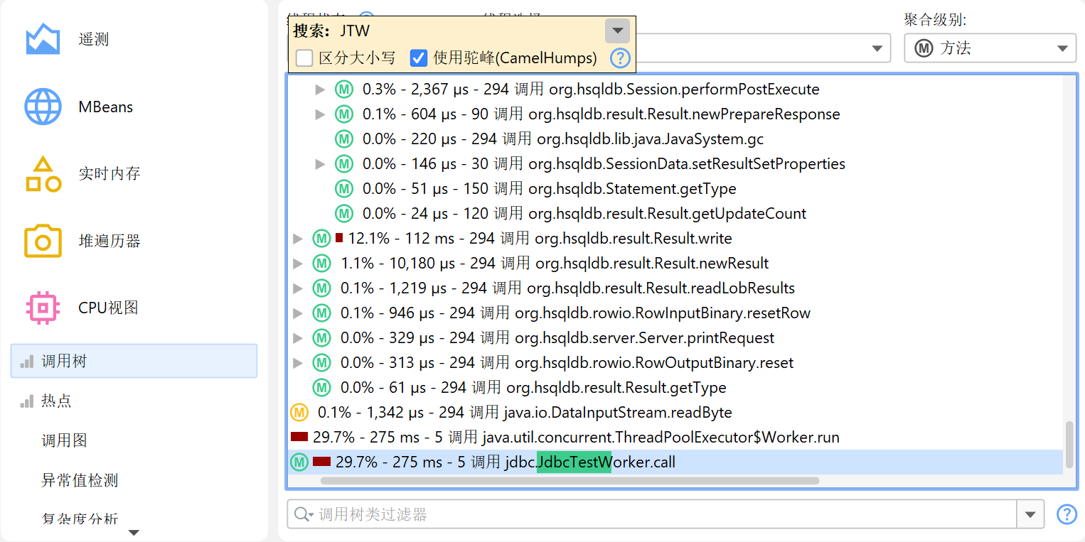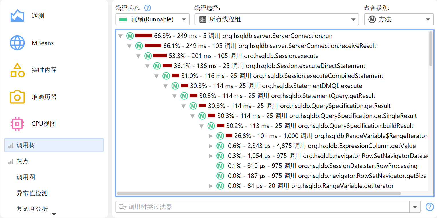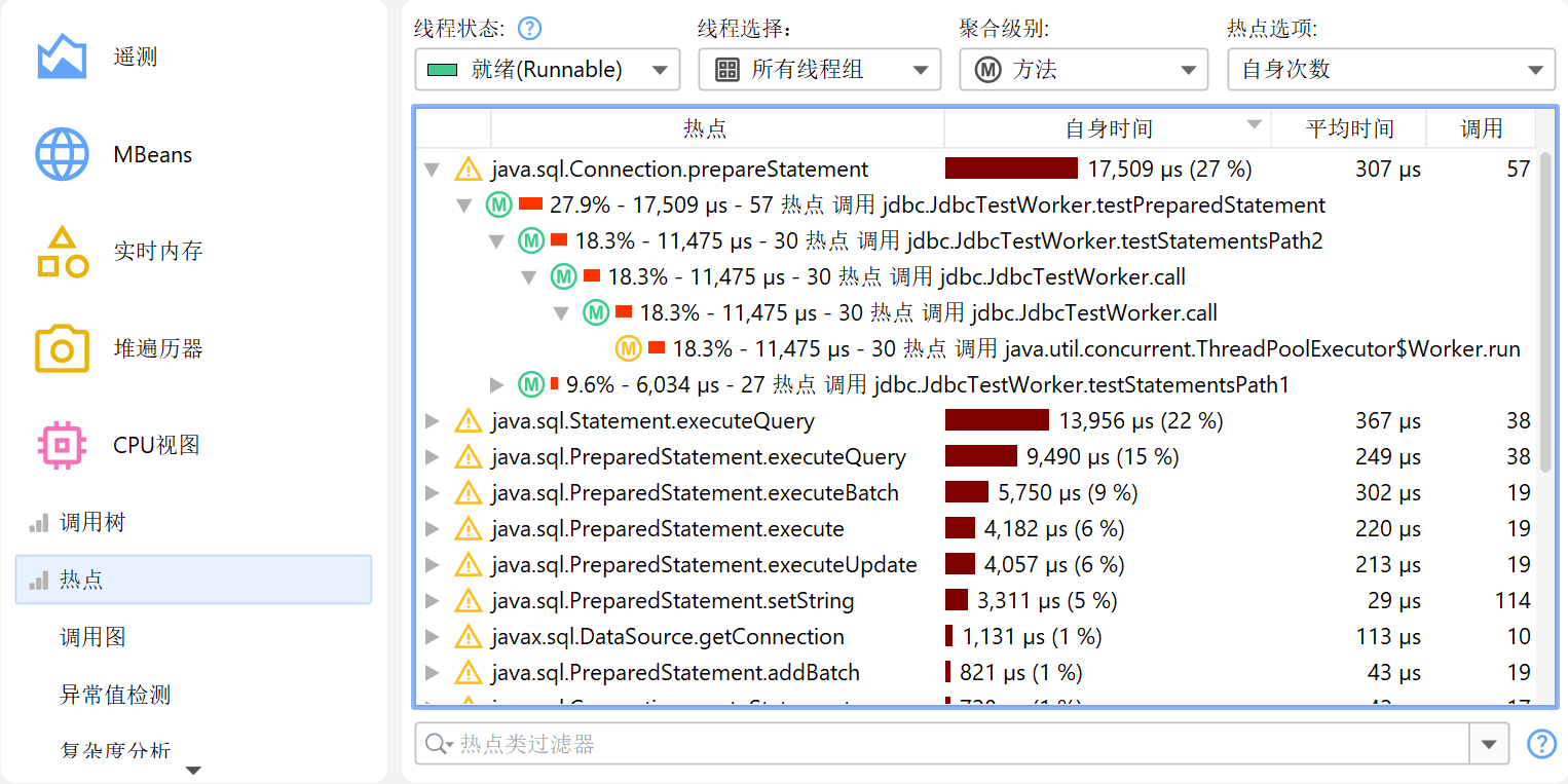 热点 (hot spot) 的概念不是绝对的,而是取决于调用树过滤器 (call tree filter)。如果你没有任何调用树过滤器,最大的热点很可能总是 JRE 核心类中的方法,如字符串操作、I/O 例程或集合操作。这些热点并不实用,因为你通常无法直接控制这些方法的调用,也无法加速它们。