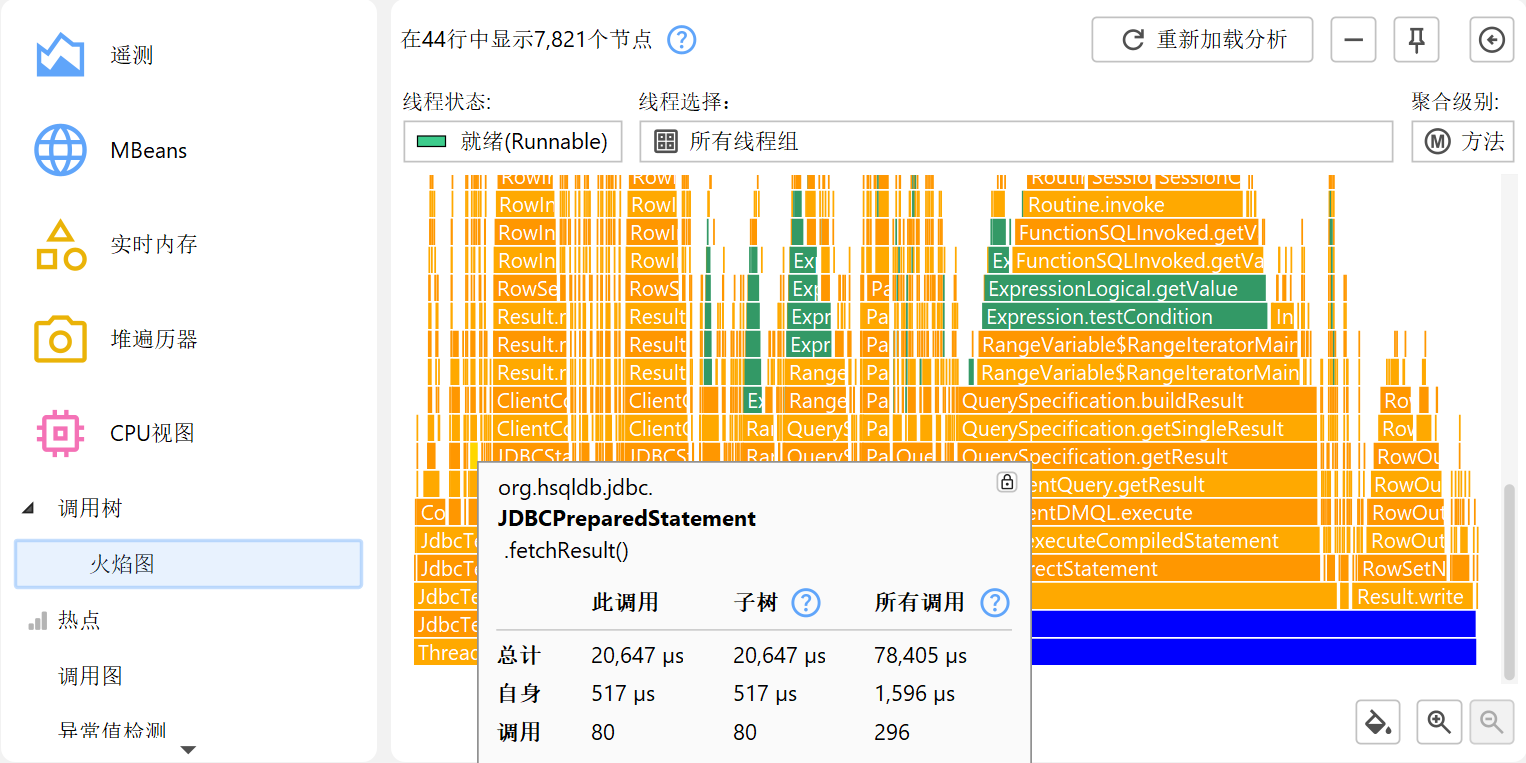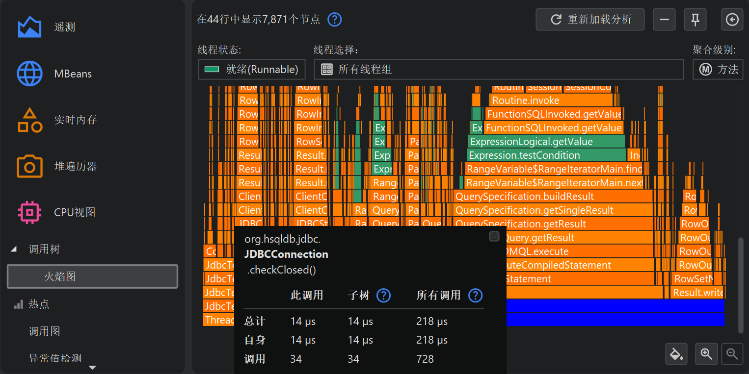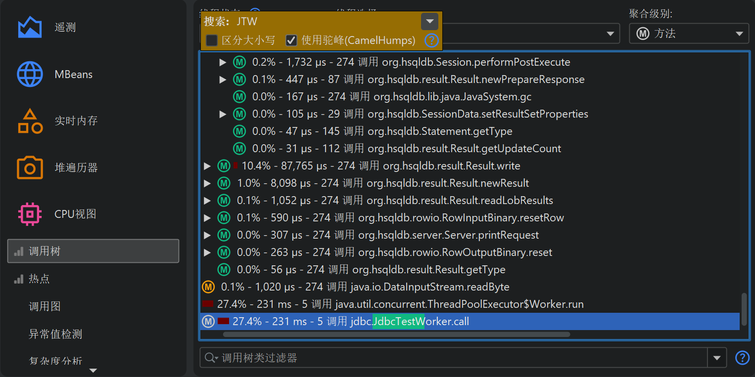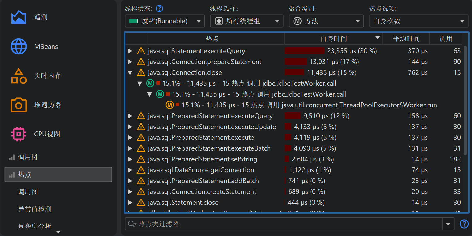 默认情况下,热点 (hot spot) 是根据自耗时 (self-time) 计算的。你也可以根据总耗时 (total time) 计算。这对于分析性能瓶颈并不太有用,但如果你想查看所有方法的列表会很方便。热点视图 (hot spot view) 只显示有限数量的方法以减少开销,因此你要找的方法可能不会显示。这种情况下,可以用底部的视图过滤器 (view filter) 过滤包或类。与调用树不同,热点视图过滤器 (hot spot view filter) 只过滤顶层节点。热点视图的截断不是全局应用的,而是针对显示的类,因此应用过滤器后可能会出现新节点。