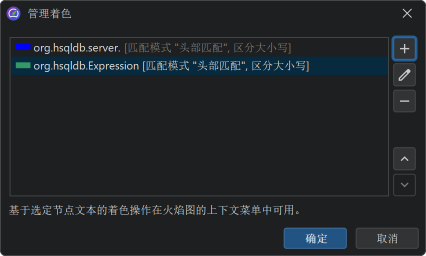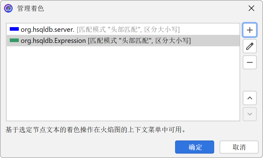 分析火焰图的另一种方式是根据类名、包名或任意搜索词添加着色 (colorization)。着色 (colorization) 可通过右键菜单添加,并在着色对话框中管理。每个节点使用第一个匹配的着色 (colorization)。着色 (colorization) 会在分析会话 (profiling session) 之间持久化,并全局应用于所有会话和快照。