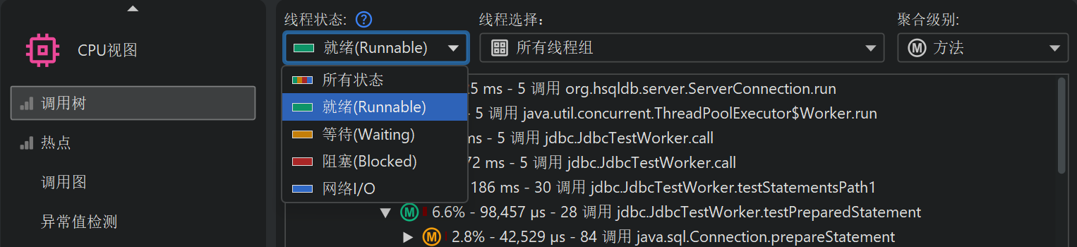 每时每刻,每个线程都有一个关联的线程状态。如果线程已准备好处理字节码指令,或正在 CPU 核心上执行,则线程状态为“Runnable”。查找性能瓶颈时,这种线程状态最为重要,因此默认选中。