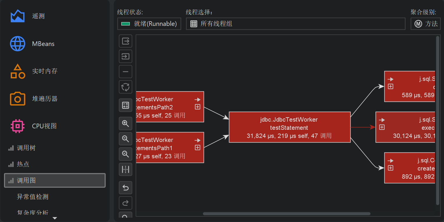 无论是在调用树还是热点视图中,每个节点都可能出现多次,尤其是递归调用时。在某些情况下,你需要以方法为中心的统计信息,每个方法只出现一次,所有入站和出站调用都可见。这样的视图最好以图 (graph) 的形式展示,在 JProfiler 中,这被称为调用图 (call graph)。