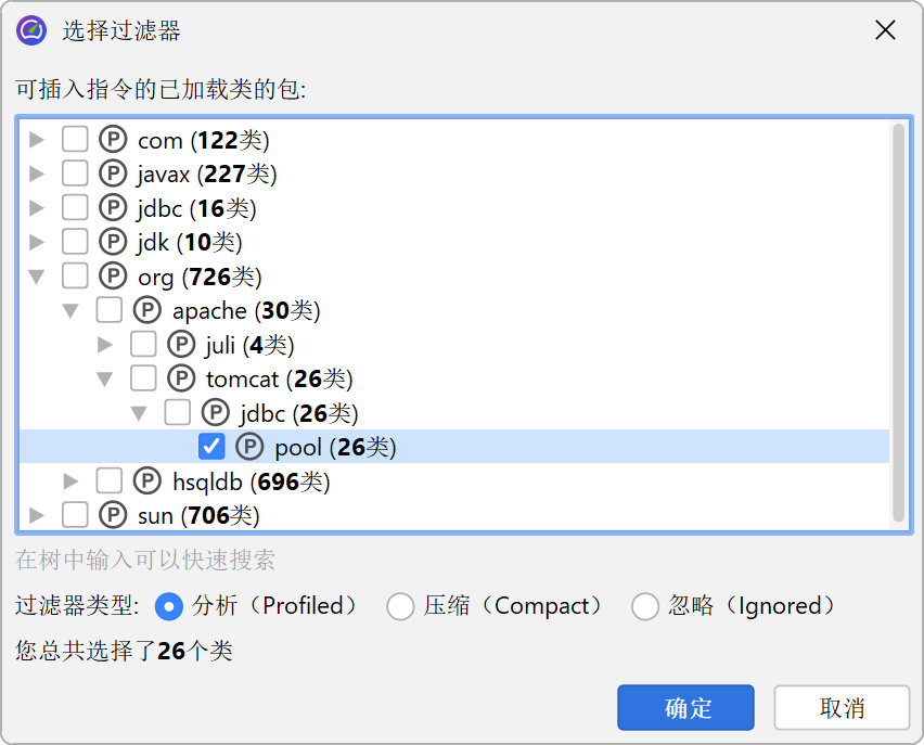 过滤器有三种类型,分别为“被分析 (profiled)”、“紧凑 (compact)”和“忽略 (ignored)”。所有“被分析 (profiled)”类中的方法都会被测量。这正是你需要分析自己代码时的设置。