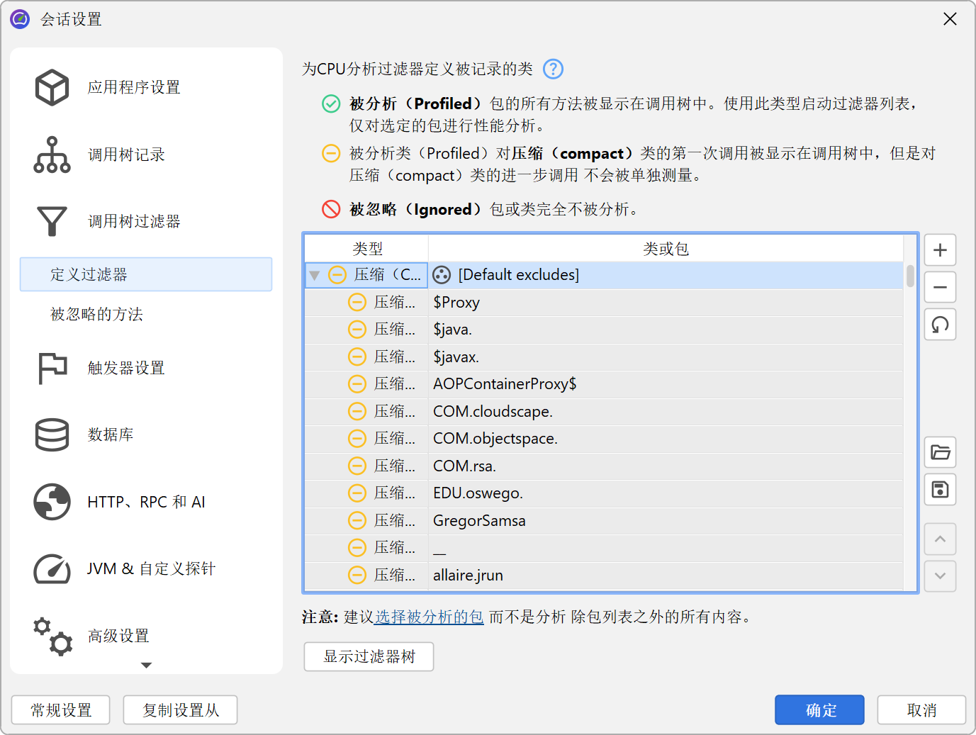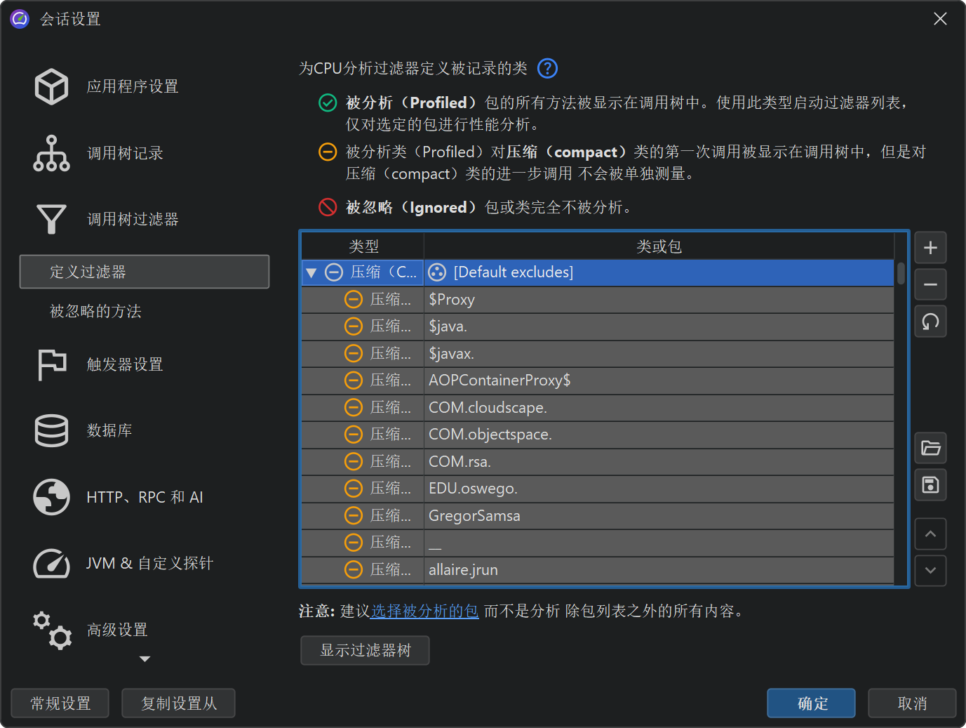 配置的过滤器列表会针对每个类自上而下依次评估。在每一步,如果匹配,当前过滤器类型可能会发生变化。列表的起始过滤器类型很重要。如果你以“被分析 (profiled)”过滤器开头,类的初始过滤器类型为“紧凑 (compact)”,意味着只有明确匹配的类会被分析 (profiled)。