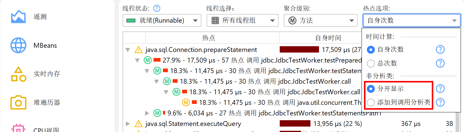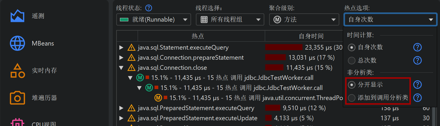 解决性能问题时,你可能希望排除库层,只关注自己的类。你可以在调用树中快速切换到这种视角,只需在热点选项弹窗中选择添加到调用的被分析类 (Add to calling profiled class)单选按钮。