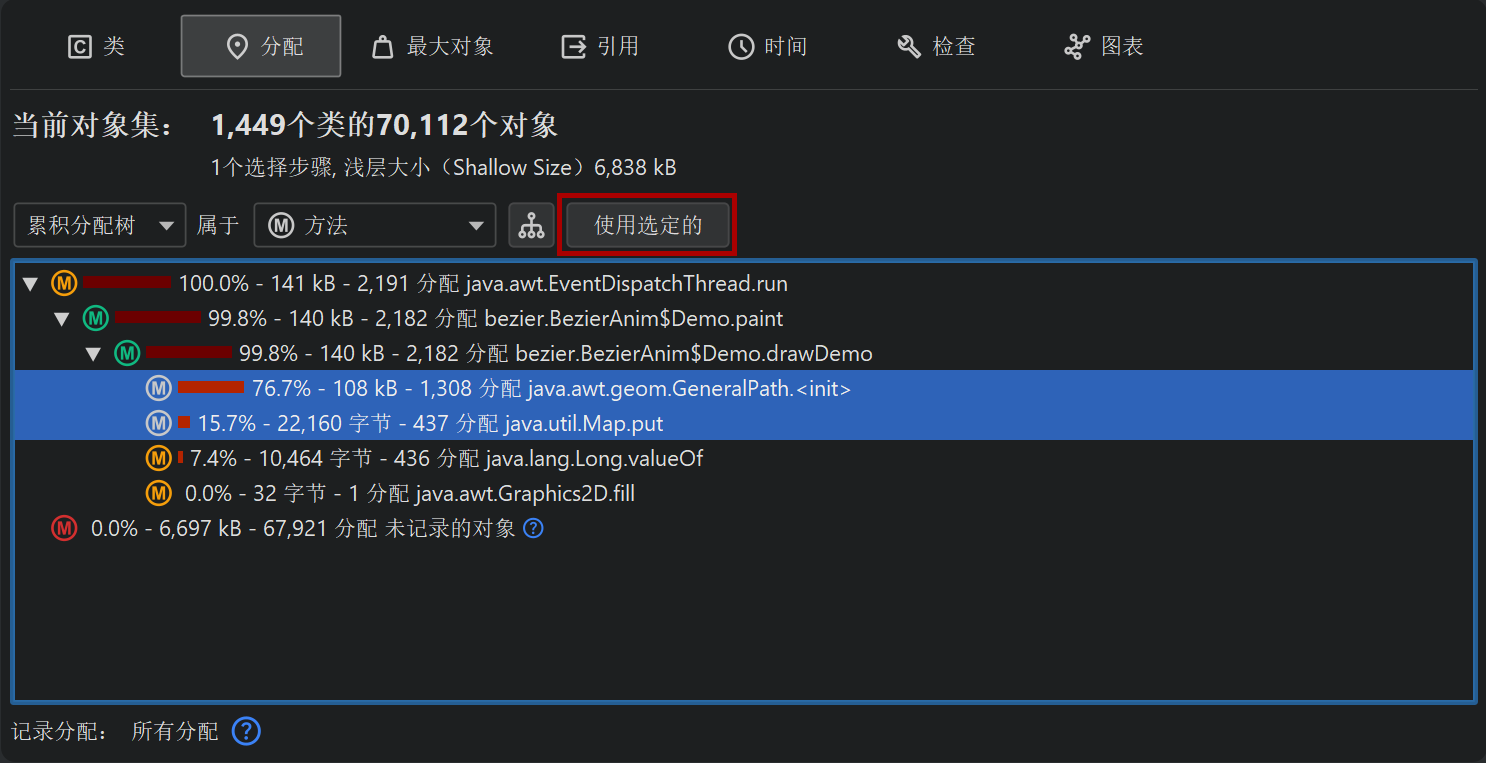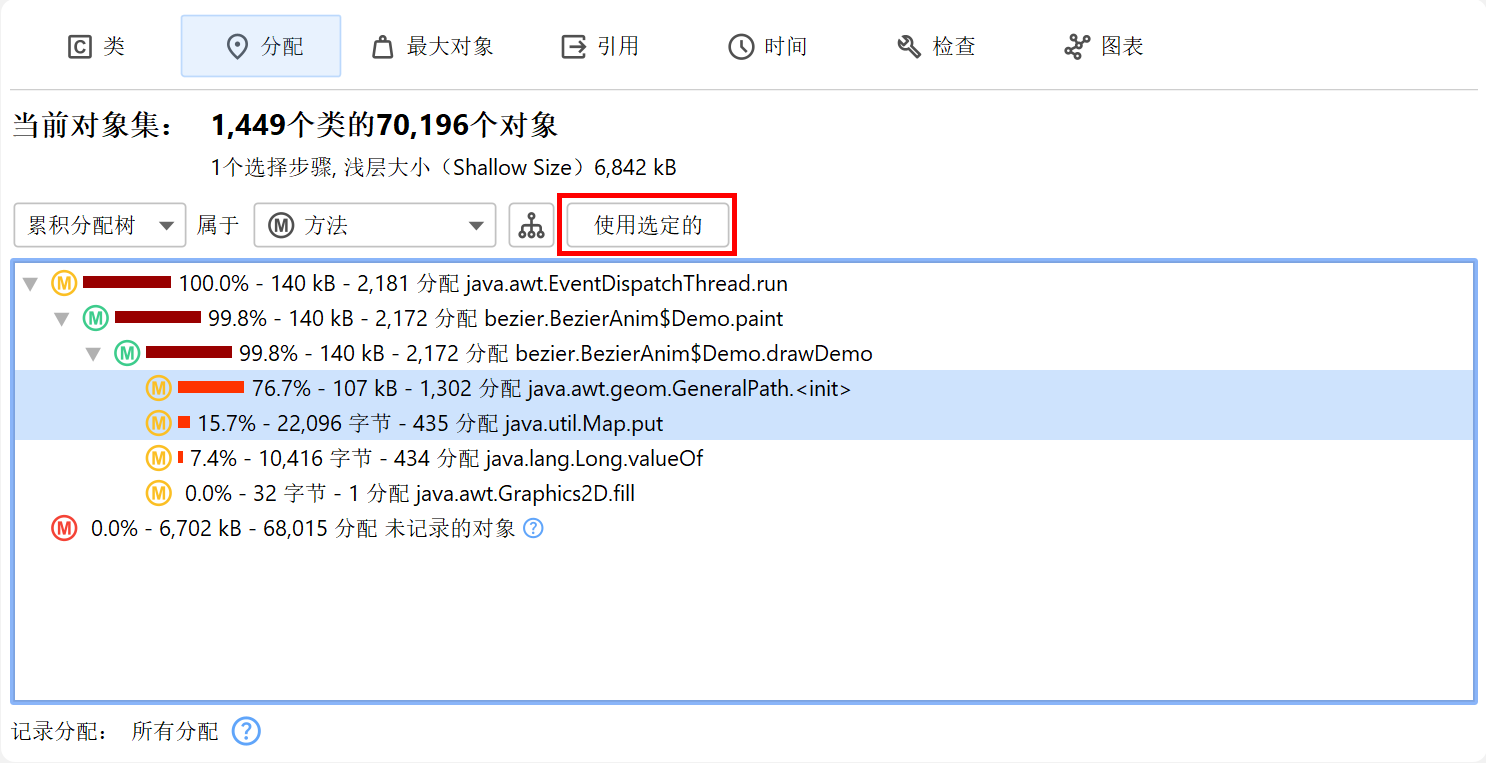 与类视图类似,你可以多选节点,并使用顶部的Use Selected按钮创建新的选择步骤。在“分配热点 (Allocation hot spots)”视图模式下,还可以在回溯 (backtraces) 中选择节点。这样只会选中在所选回溯结尾的调用栈上分配的顶级热点对象。