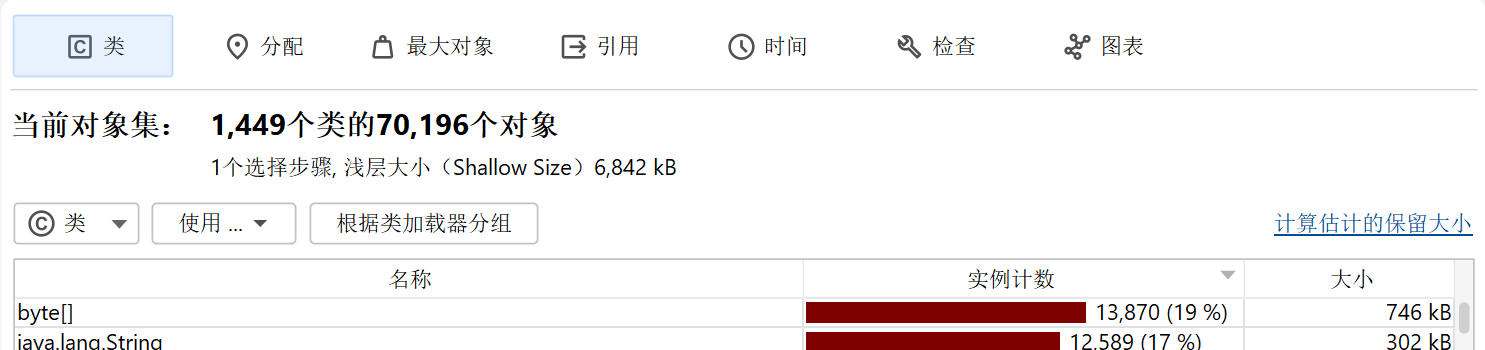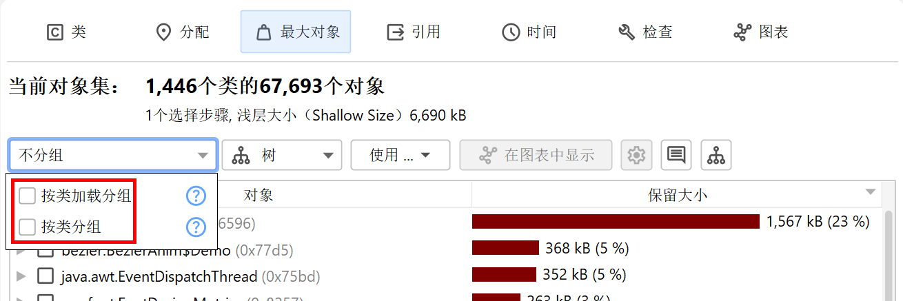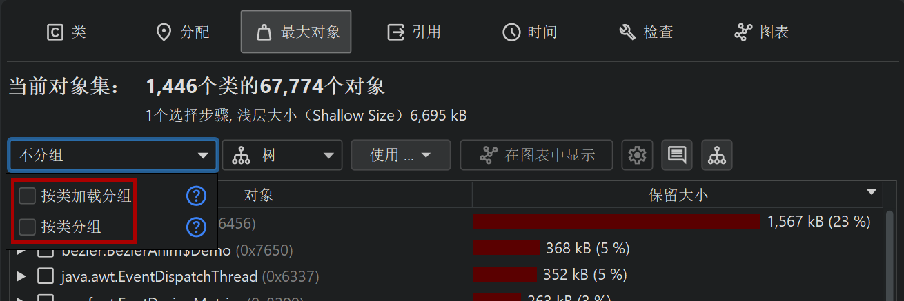 支配树除了可以显示单个对象外,还可以将最大对象按类分组。视图顶部的分组下拉框有一个复选框可激活该显示模式。此外,还可以在顶层添加类加载器分组。类加载器分组在计算最大对象后应用,显示最大对象所属类的加载者。如果只想分析某个特定类加载器的最大对象,可以先使用“按类加载器分组”检查项。