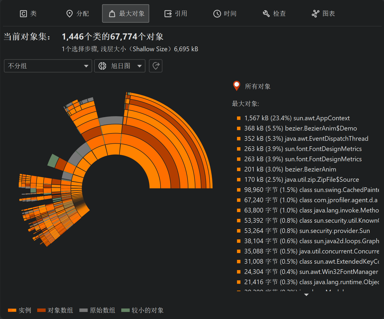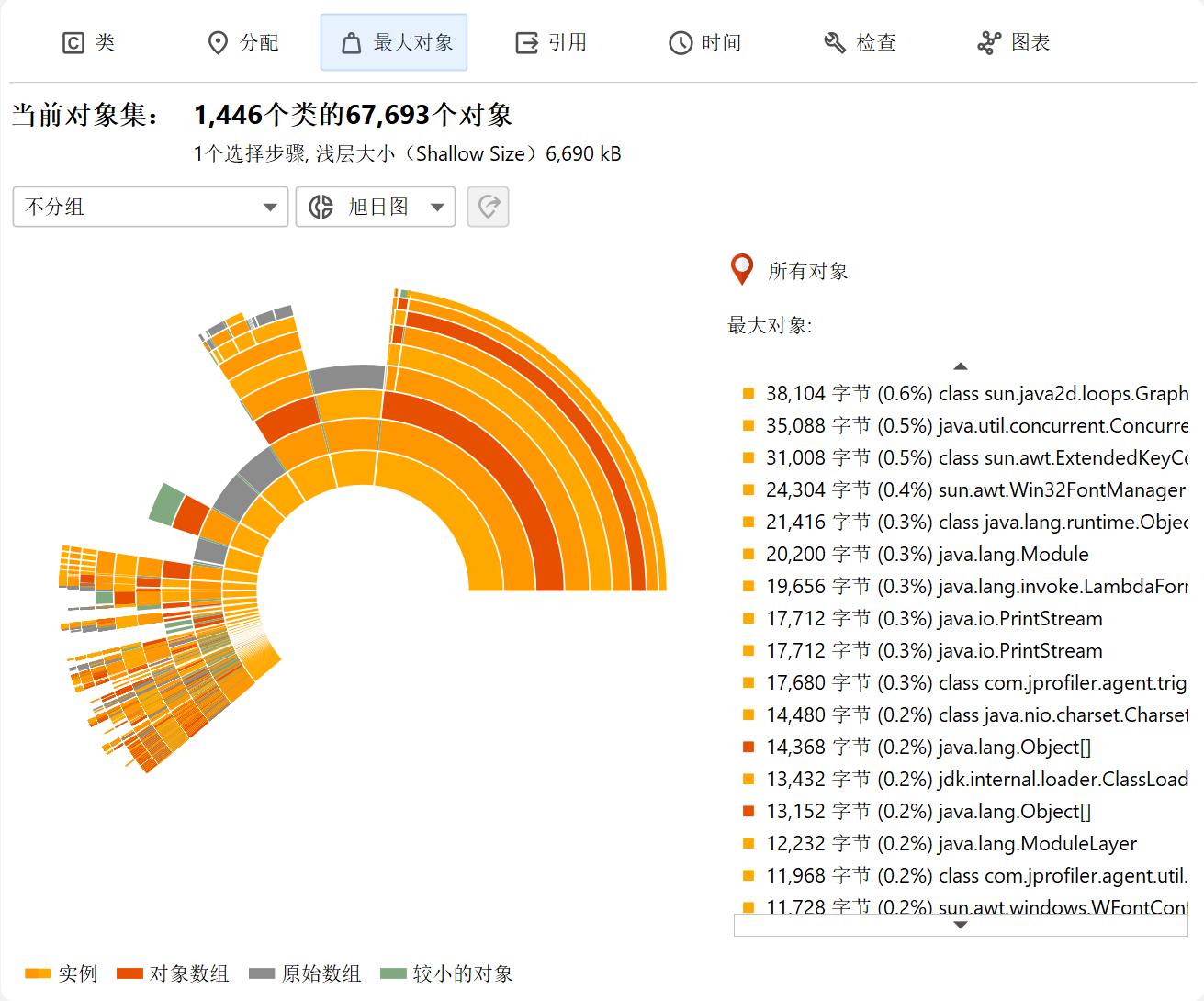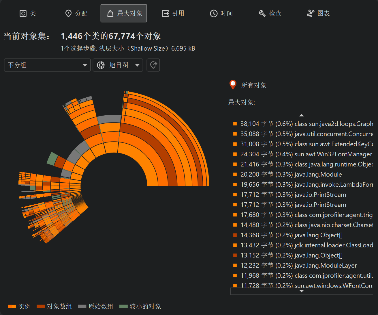 最大对象视图上方的视图模式选择器允许你切换到旭日图 (sunburst diagram)。该图由一系列同心分段圆环组成,能在一张图中展示支配树的全部内容(有最大深度限制)。引用从最内圈发出,向外圈传播。这种可视化方式信息密度高,能帮助你发现引用模式,并通过特殊着色 (colorization) 一眼识别大型原始数组和对象数组。