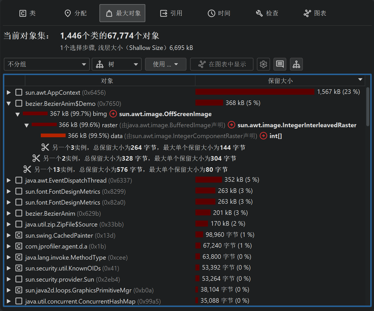 在支配树每个引用节点的左侧,会有一个大小条,显示目标对象仍保留顶级对象保留大小的百分比。随着你深入树结构,数值会逐步减少。在视图设置中,可以将百分比基准切换为整个堆的总大小。