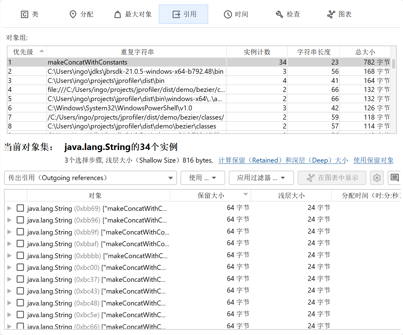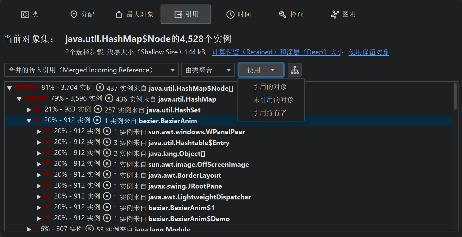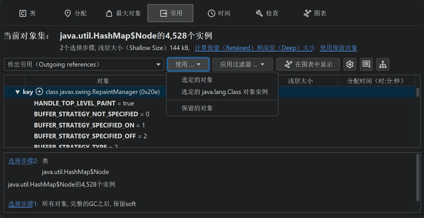 出引用视图类似于IDE调试器中的对象视图。展开对象时,可以看到原始数据和对其他对象的引用。任何引用类型都可以作为新对象集选中,也可以一次多选对象。与类视图类似,可以选择保留对象或关联的java.lang.Class对象。如果选中的是标准集合,还可以一键选中所有包含的元素。对于类加载器对象,还可以选中所有已加载实例。