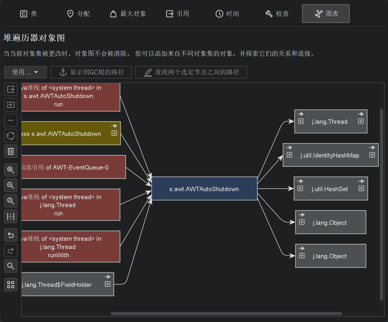 堆遍历器图形不会自动显示当前对象集中的任何对象,也不会在更改当前对象集时自动清空。你需要在出引用视图、入引用视图或最大对象视图中手动选中实例,并通过Show In Graph操作将其添加到图形中。
