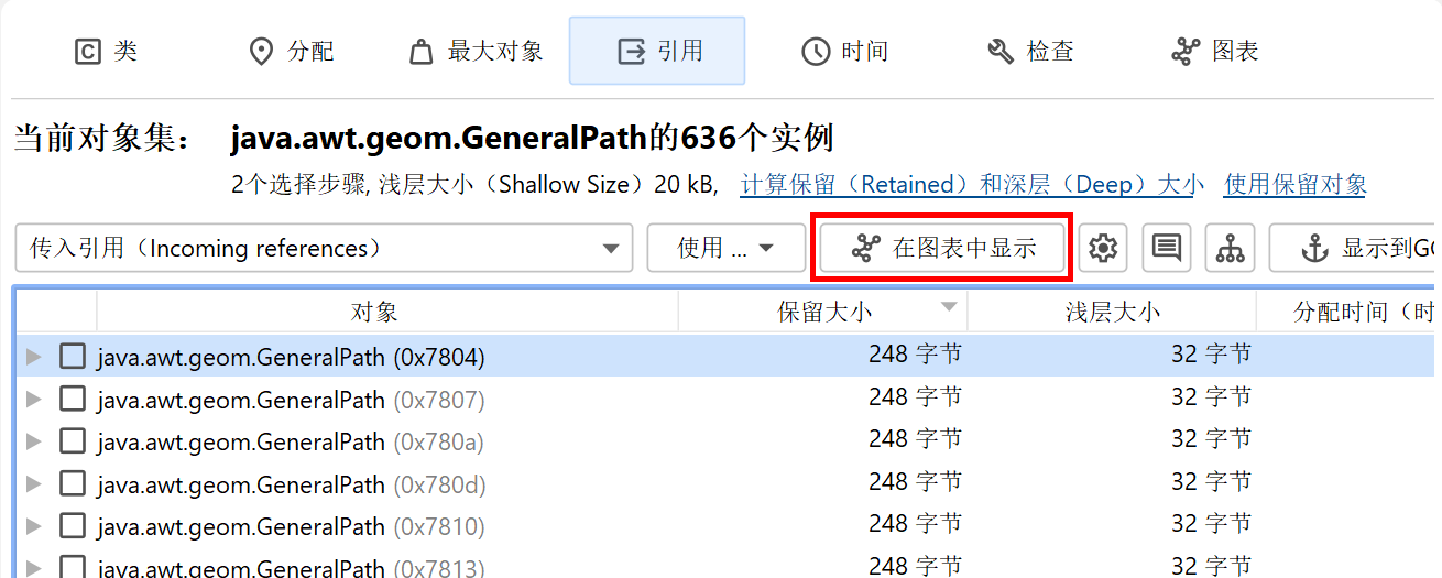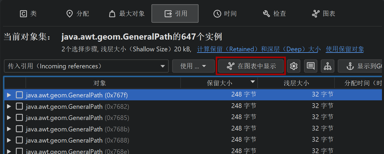 与入引用视图类似,图形中有Show Path To GC Root按钮,可展开到垃圾回收根的一条或多条引用链(如有)。此外,还有Find Path Between Two Selected Nodes操作(当选中两个实例时可用),可查找有向或无向路径,并可选择是否沿弱引用查找。如果找到合适路径,会以红色高亮显示。