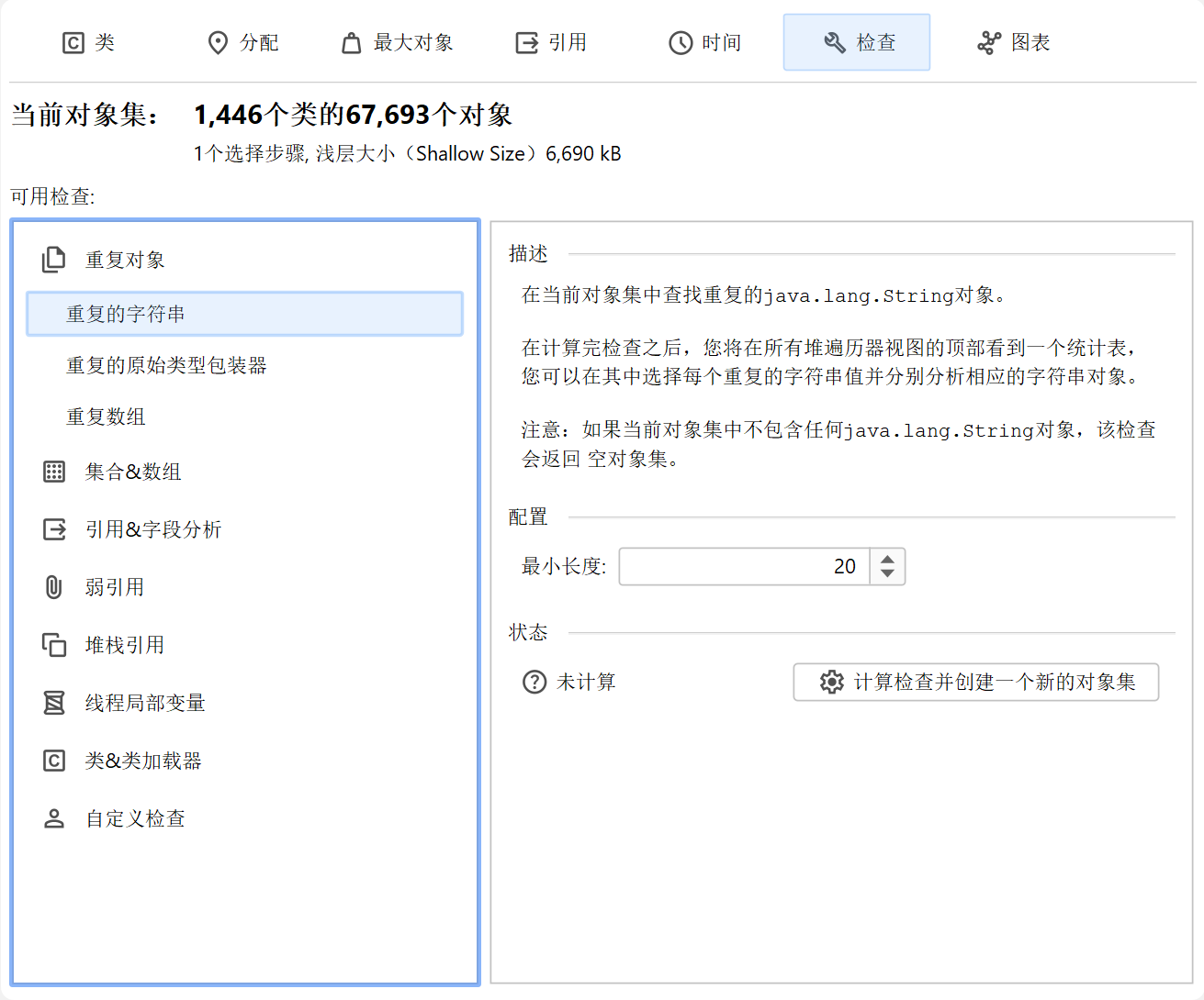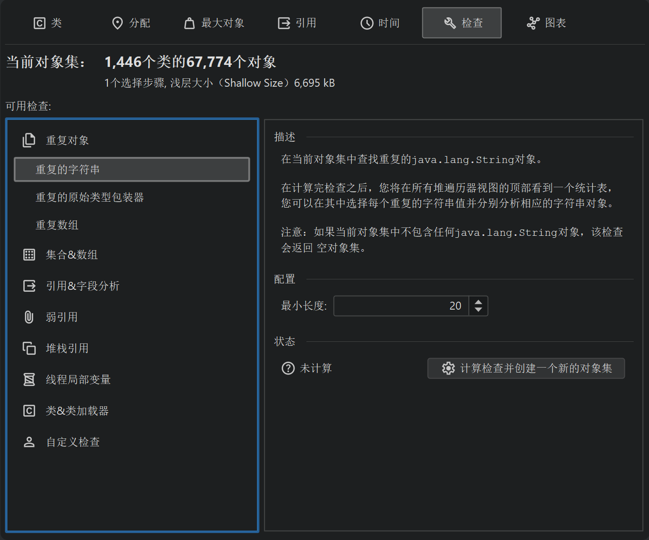 “检查项 (Inspections)”视图本身不显示数据,而是提供多种堆分析方式,根据特定规则创建新对象集,这些规则在其他视图中不可用。例如,你可能想查看所有被线程本地变量 (thread local) 保留的对象,这在引用视图中无法实现。检查项分为多个类别,具体说明见其描述。