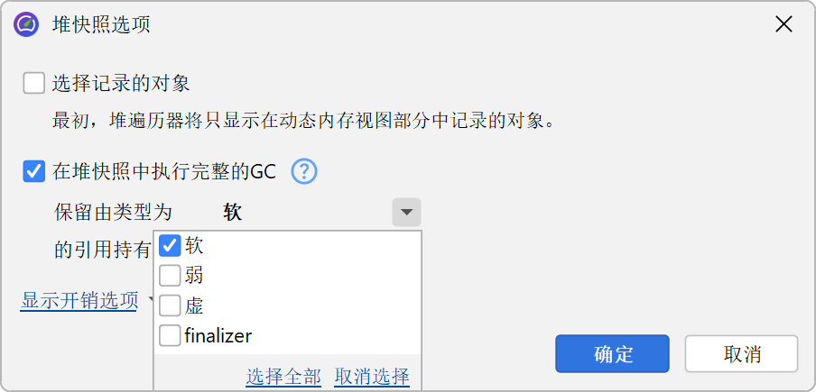 获取堆快照时,可以指定控制初始对象集的选项。如果已记录分配,Select recorded objects复选框会将初始显示对象限制为已记录的对象。数量通常与实时内存视图不同,因为堆遍历器会移除无引用对象。未记录对象仍然存在于堆快照中,只是不会在初始对象集中显示。通过后续选择步骤仍可访问未记录对象。