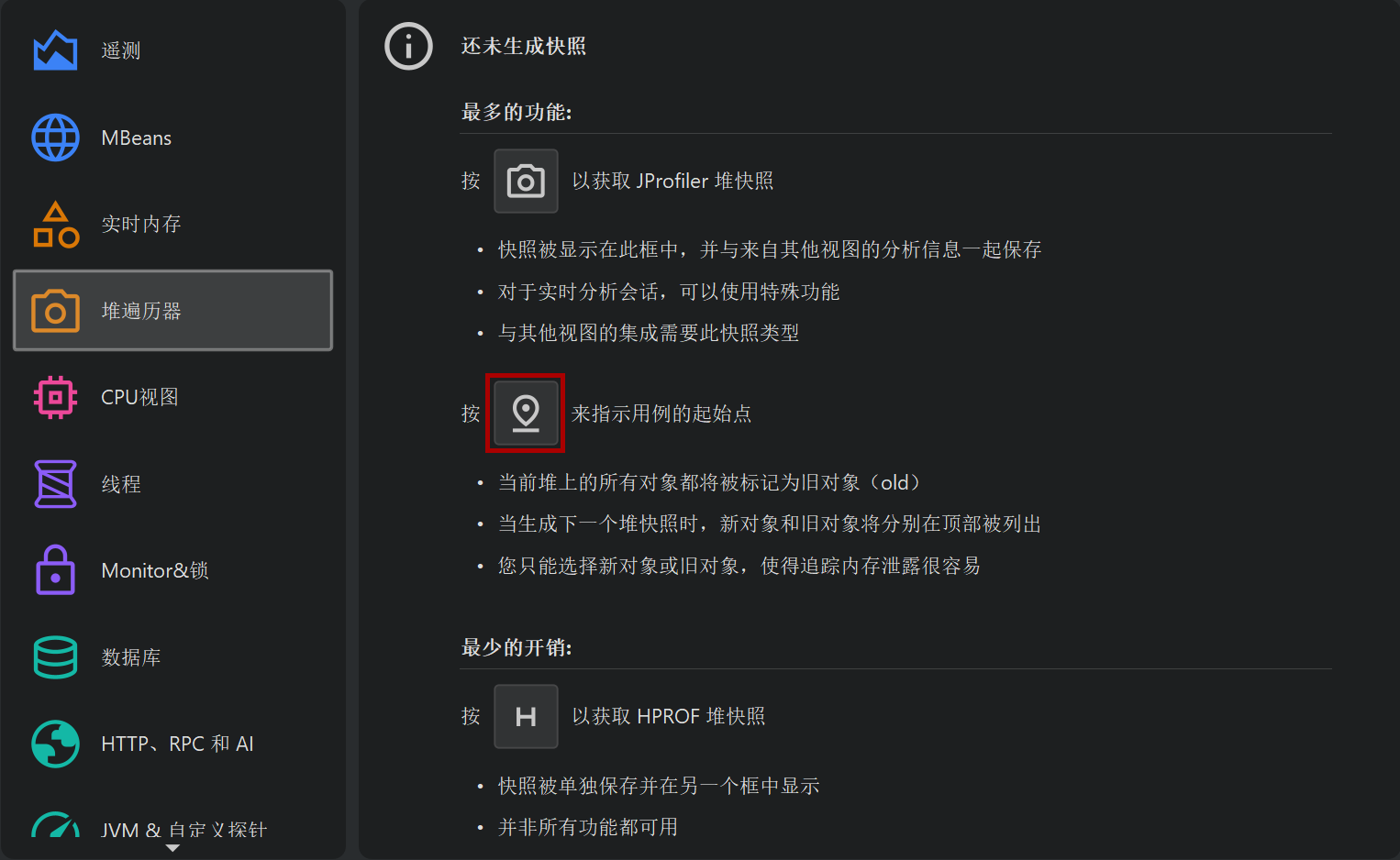在堆遍历器的概览页面,你可以选择创建JProfiler堆快照或HPROF/PHD堆快照。默认推荐使用JProfiler堆快照。HPROF/PHD堆快照适用于某些特殊场景,相关内容请参见另一章节。