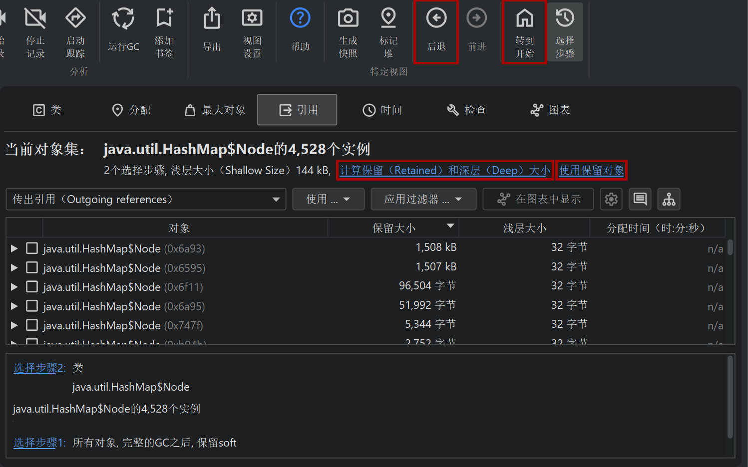 头部区域现在会显示有两个选择步骤,并包含用于计算保留 (retained) 和深度 (deep) 大小的链接,或用于选中当前对象集所保留的所有对象。后者会增加一个选择步骤,并建议切换到类视图,因为该对象集很可能包含多个类。