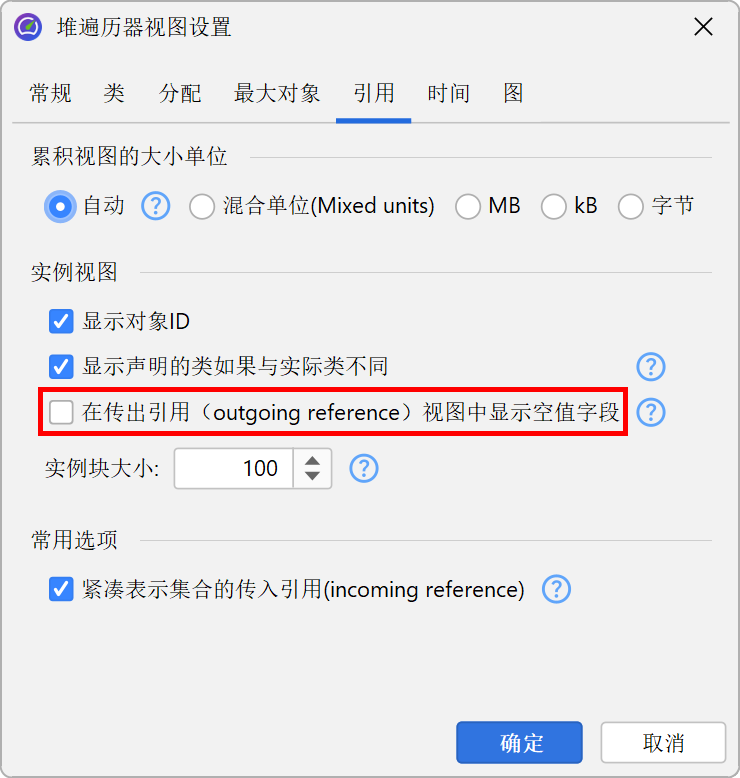 入引用视图是解决内存泄漏的主要工具。要查找对象为何未被垃圾回收,可点击Show Paths To GC Root按钮,查找到垃圾回收根的引用链。关于该主题的详细信息,请参见内存泄漏章节。