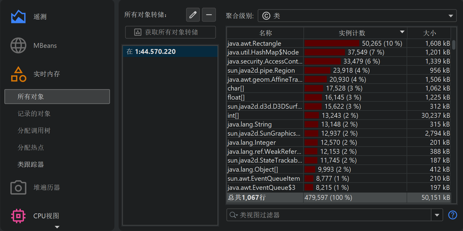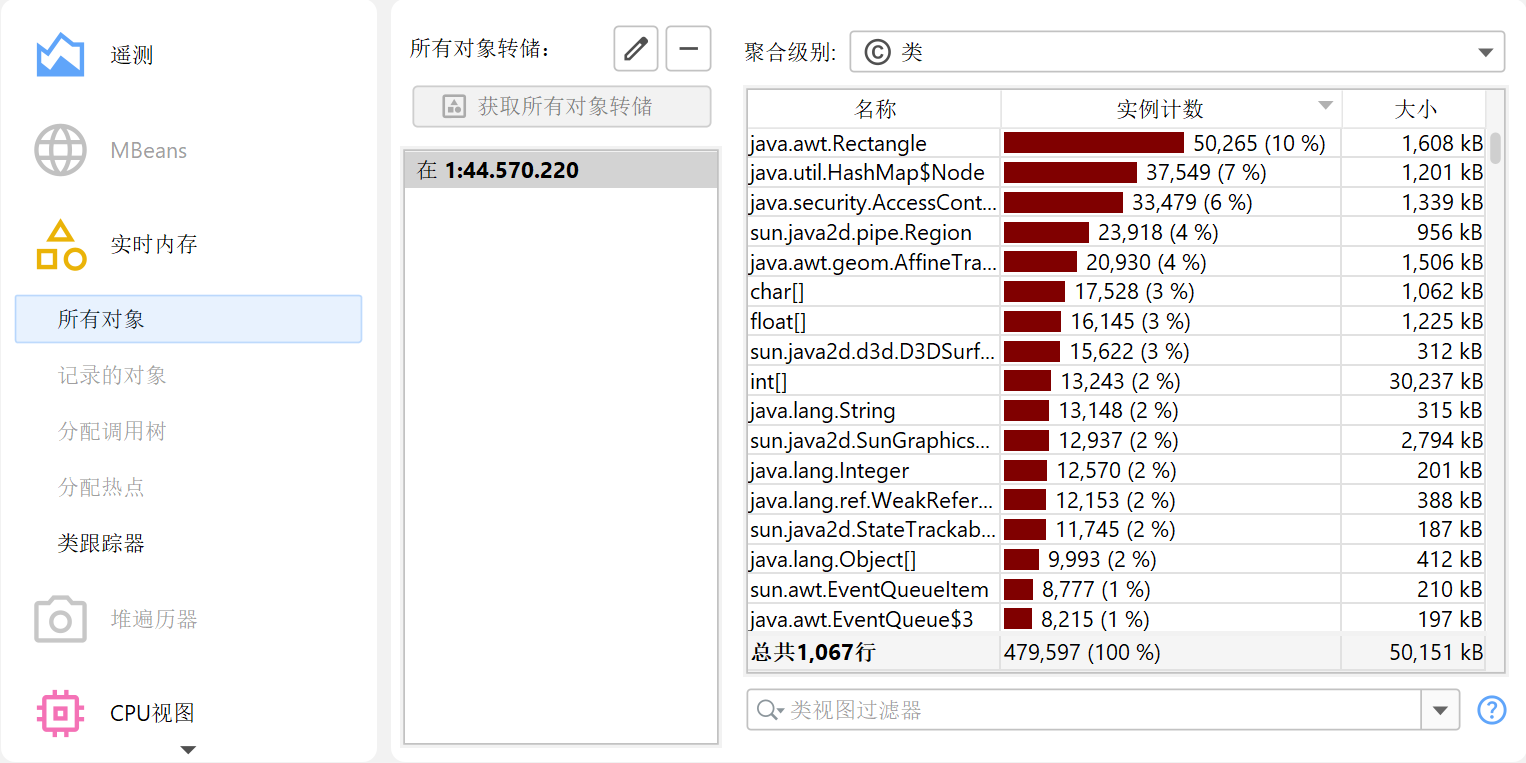 延续上面的例子,JProfiler能够展示所有类的实例数,但不包含时间顺序信息。这就是“All objects”视图,每个类作为表格中的一行展示。该视图的刷新频率低于每秒一次,并可能根据测量带来的开销自动调整。统计所有类的实例数相对开销较大,堆中的对象越多,耗时越长。因此,“All objects”视图不会自动刷新,您需要手动创建新的对象快照(dump)。